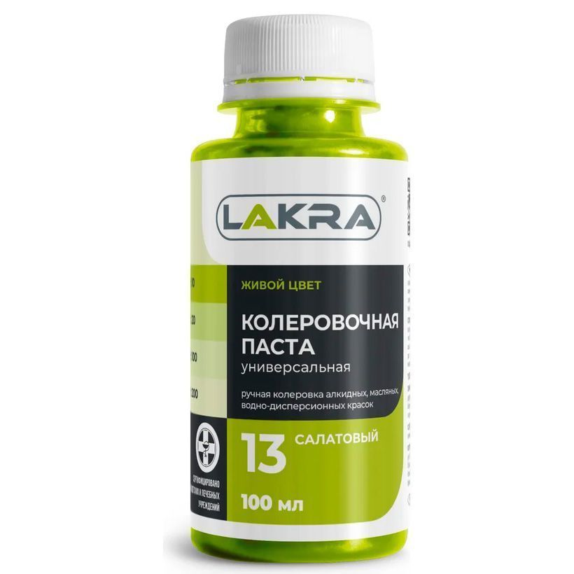 Колер-паста Лакра 13 салатовый, универсальная. Состав: Пигменты, наполнитель, этиленгликоль, технологические добавки (противоседиментационные, диспергатор, пеногаситель).