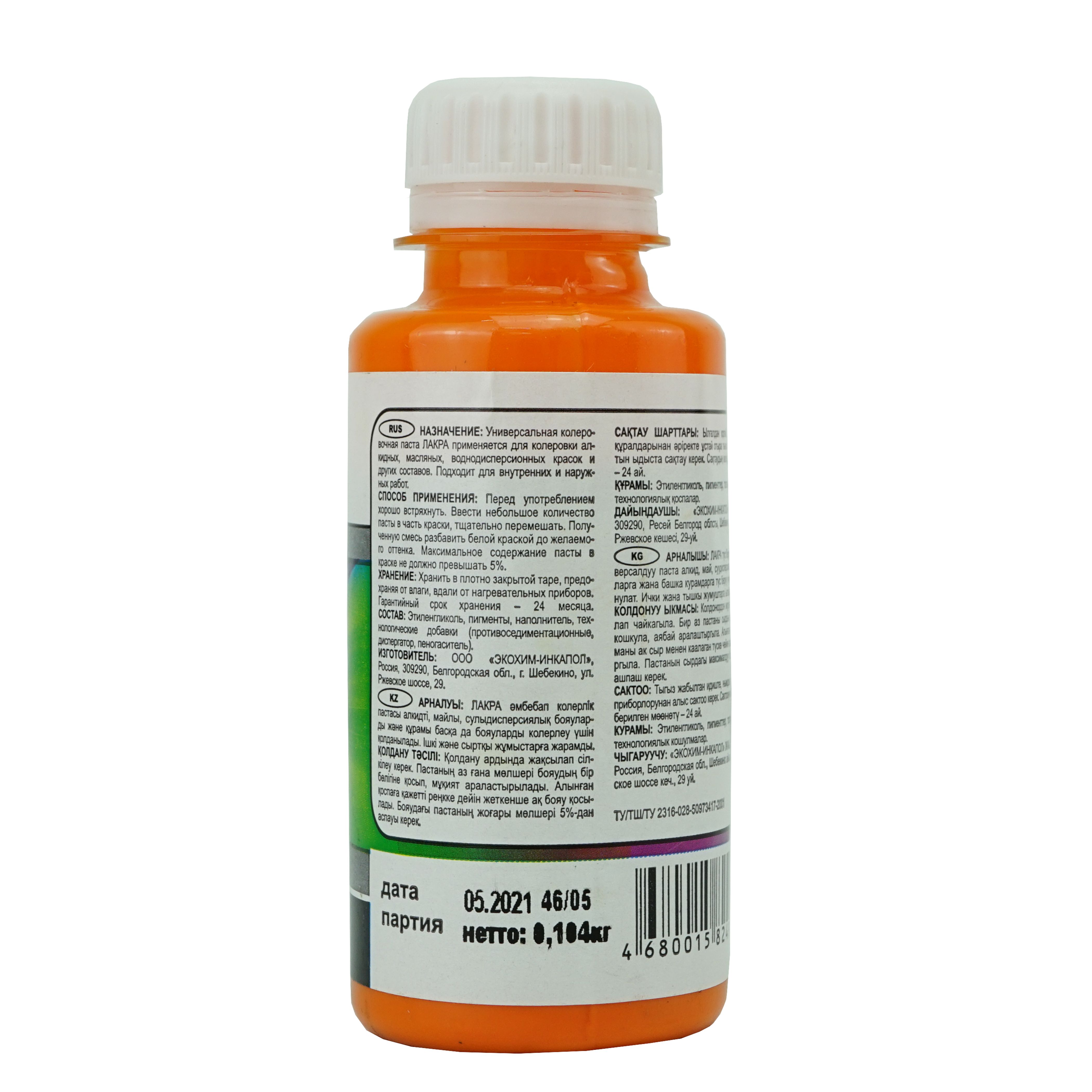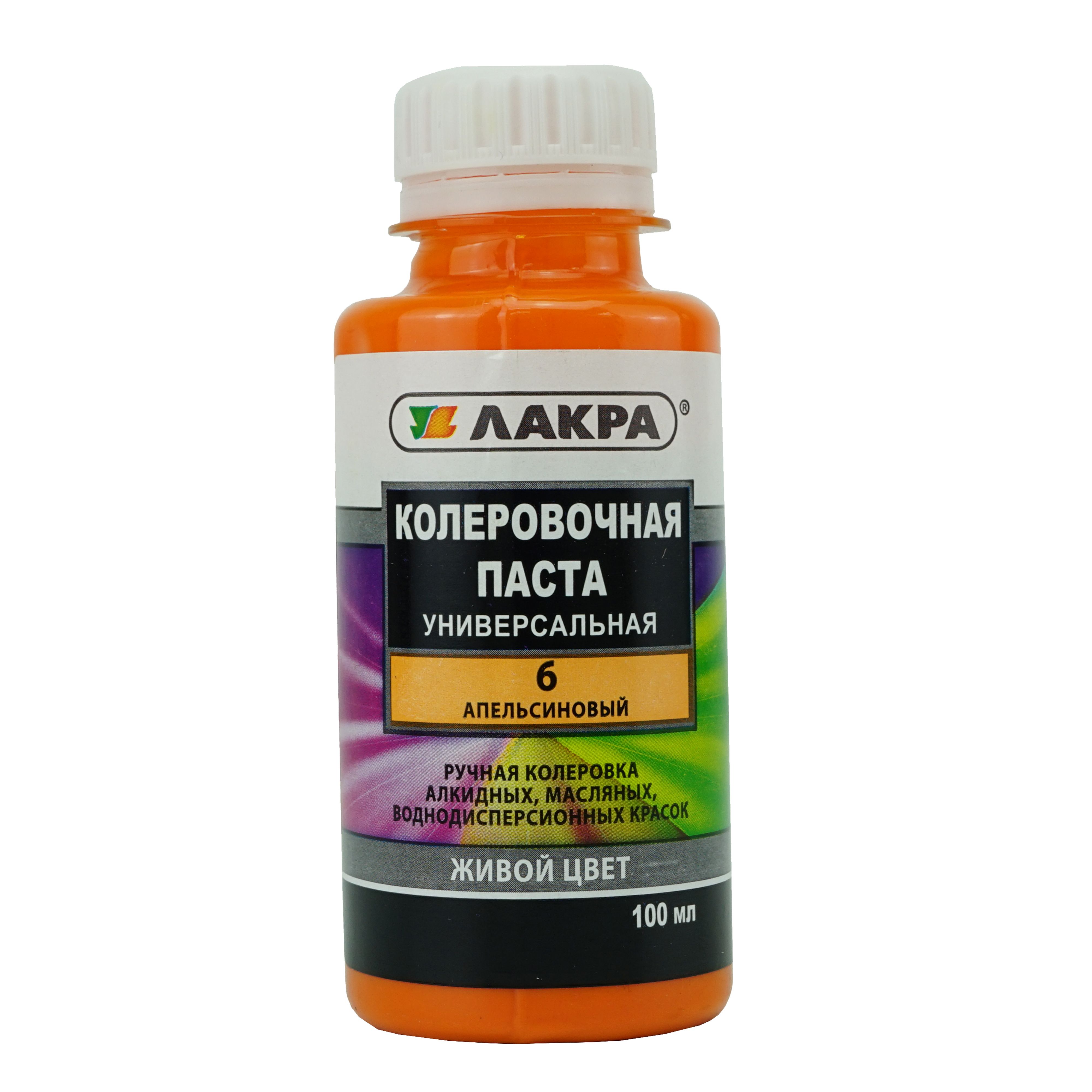 Колер-паста Лакра 06 апельсиновый, универсальная. Состав: Пигменты, наполнитель, этиленгликоль, технологические добавки (противоседиментационные, диспергатор, пеногаситель).
