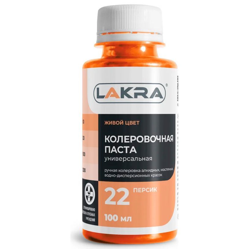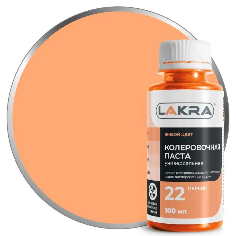 Колер-паста Лакра 22 персиковый, универсальная. Состав: Пигменты, наполнитель, этиленгликоль, технологические добавки (противоседиментационные, диспергатор, пеногаситель).