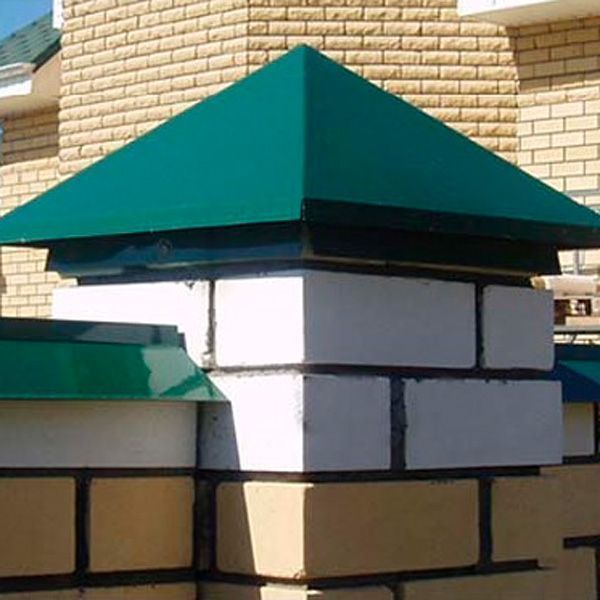Предназначен для защиты заборных столбов от преждевременного разрушения при воздействии осадков и механических повреждений, а также для декоративной отделки. Кирпичный столб с колпаком имеет законченный эстетичный внешний вид.