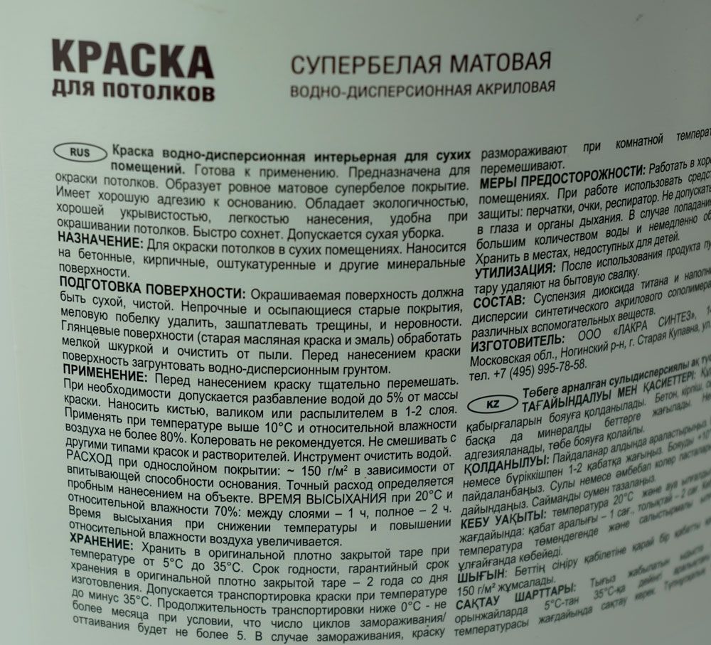 Краска водно-дисперсионная интерьерная для сухих помещений. Готова к применению. Предназначена для окраски потолков. Образует ровное матовое супербелое покрытие. Имеет хорошую адгезию к основанию. Обладает экологичностью, хорошей укрывистостью, легкостью нанесения, удобна при окрашивании потолков. Быстро сохнет. Допускается сухая уборка.