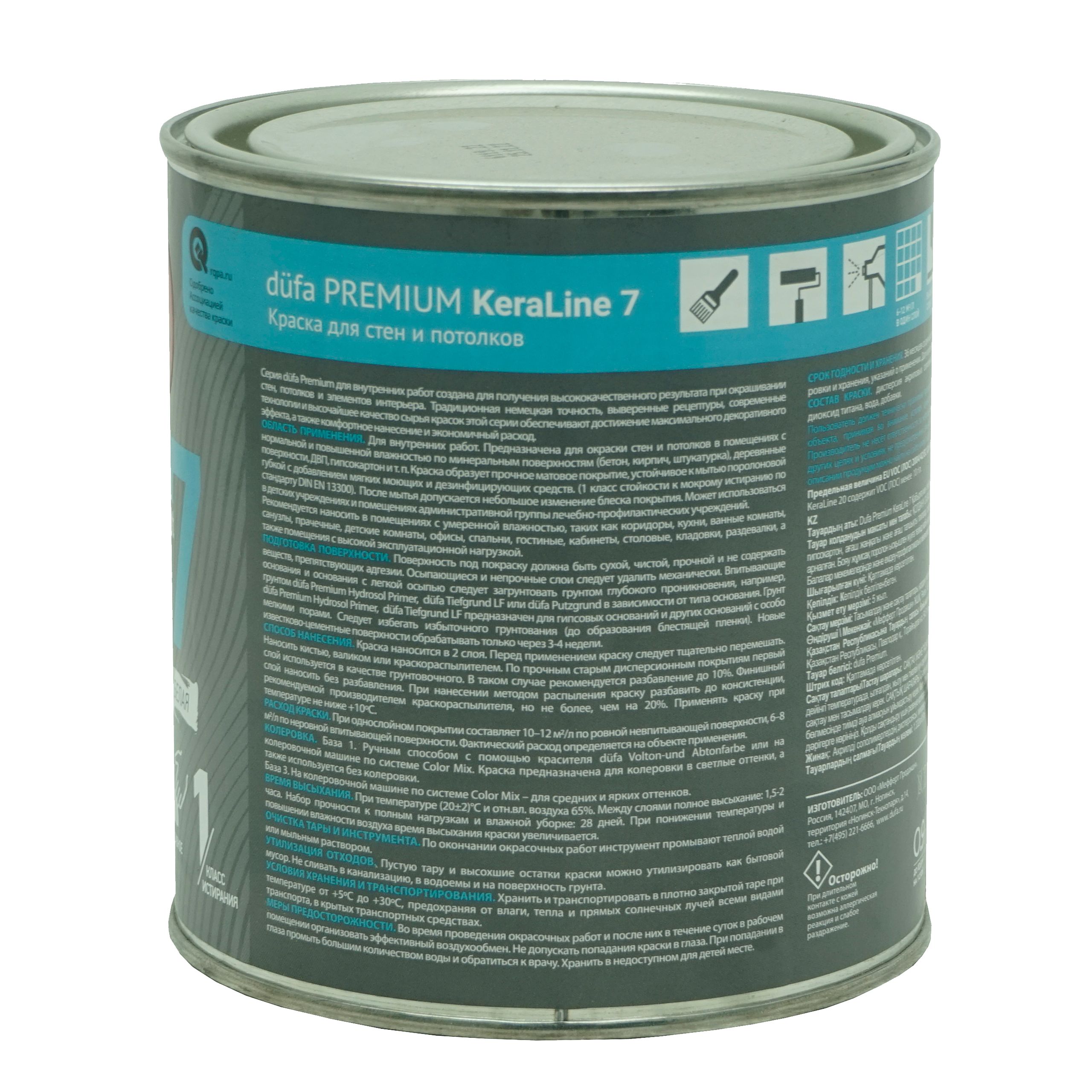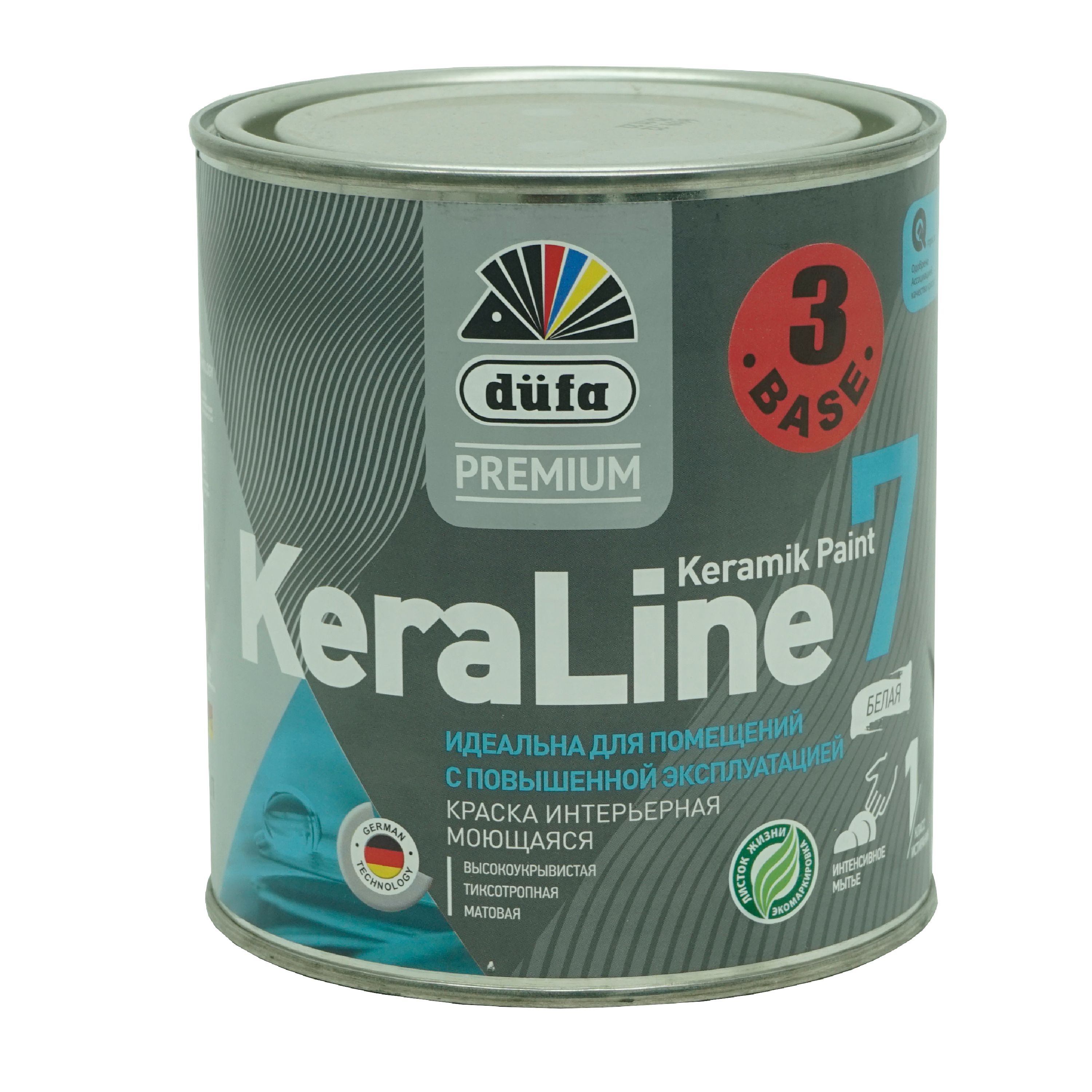 Краска для стен и потолков Dufa Premium KeraLine Keramik Paint 7 матовая предназначена для окраски стен и потолков в помещениях с нормальной и повышенной влажностью по деревянным, минеральным поверхностям (бетон, кирпич, штукатурка), гипсокартону, ДСП, и т.п. Образует прочное матовое покрытие, устойчивое к мытью поролоновой губкой с добавлением моющих и дезинфицирующих средств. После мытья допускается небольшое изменение блеска покрытия. Может использоваться в детских учреждениях и помещениях административной группы лечебно-профилактических учреждений.