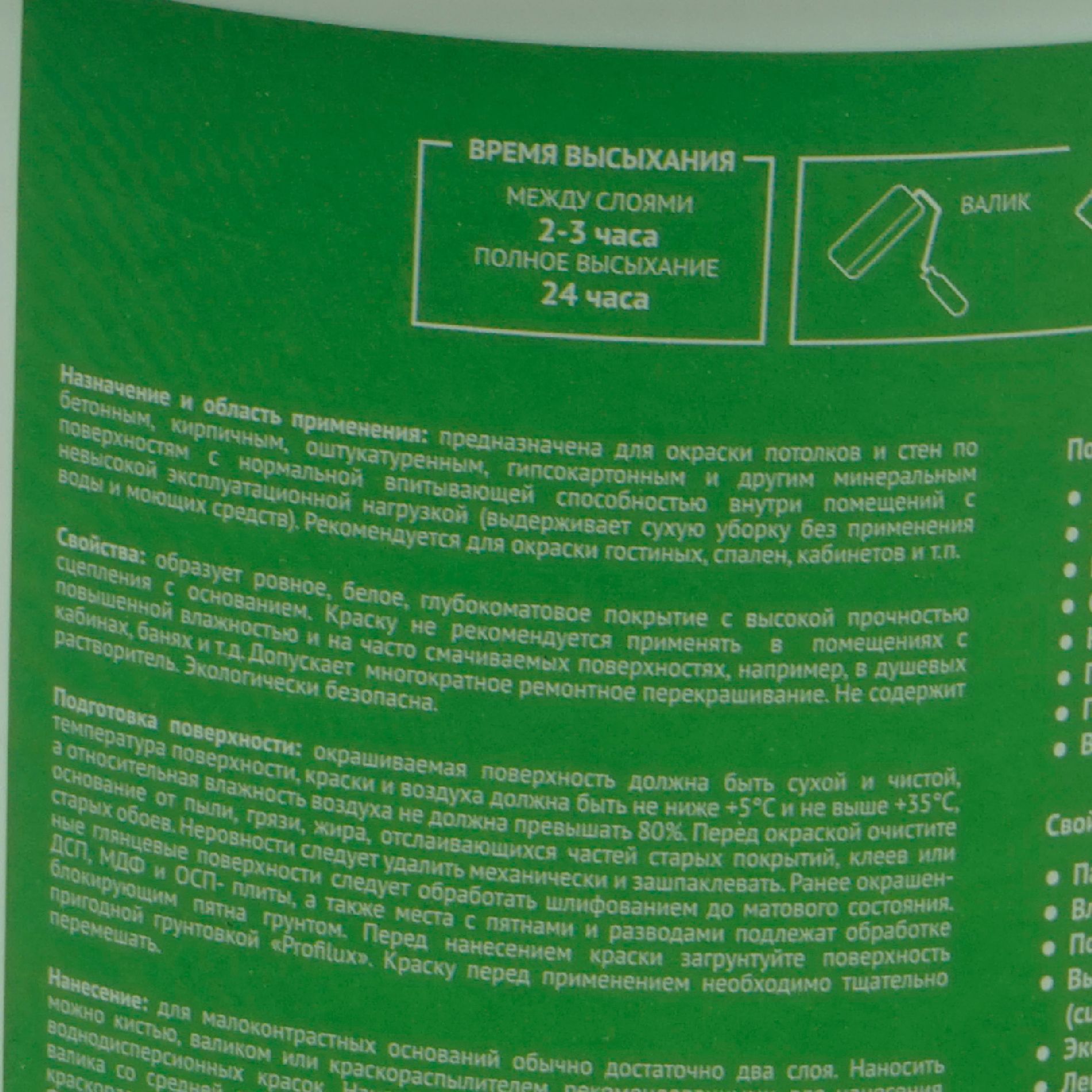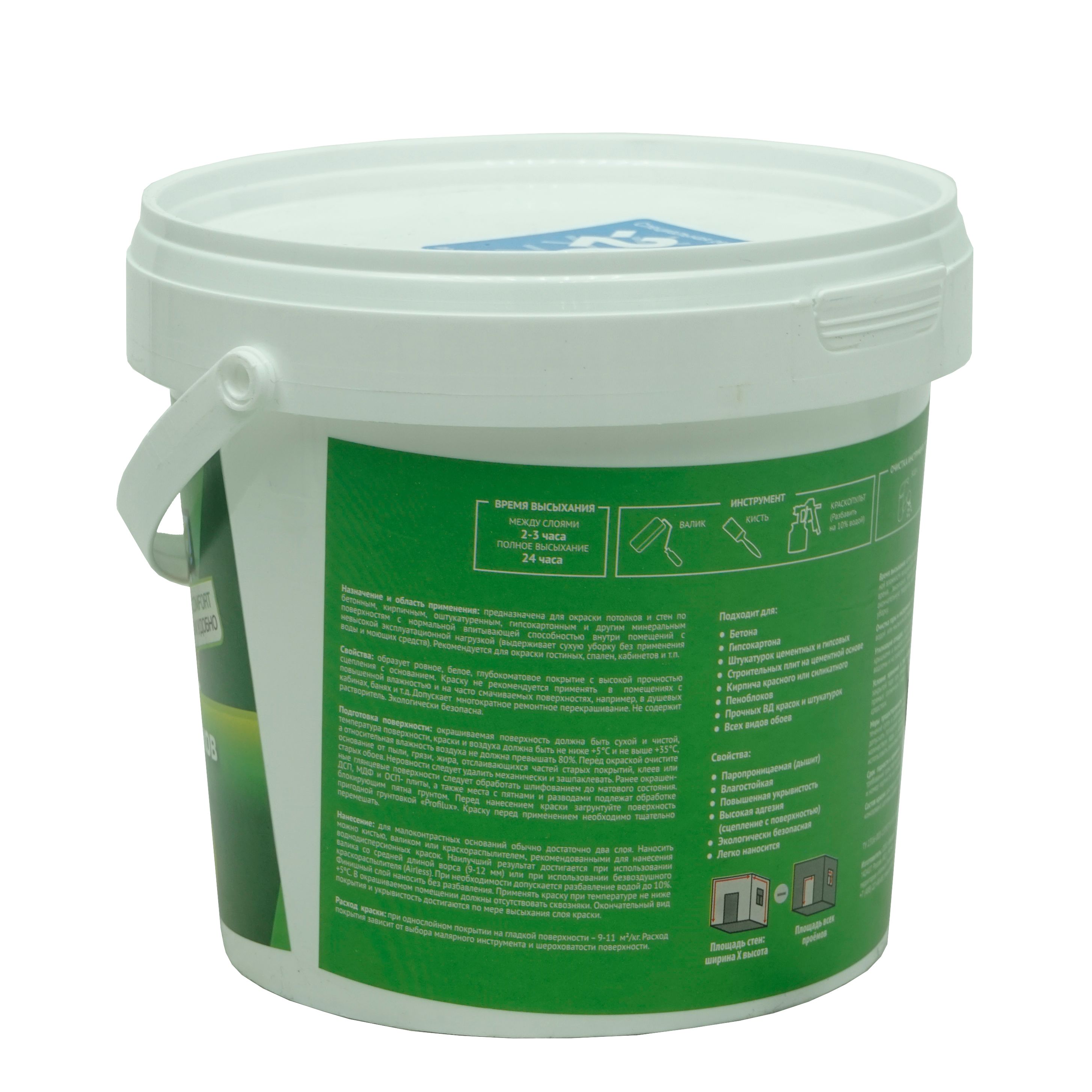 Применяется для окраски стен и потолков в жилых и общественных зданиях, помещениях, не подвергающихся сильным эксплуатационным нагрузкам. Краска применяется на все виды минеральных оснований, включая асбестоцемент, газобетон, гипсовые штукатурки, гипсокартонные плиты, на старые, но еще прочные лакокрасочные покрытия.