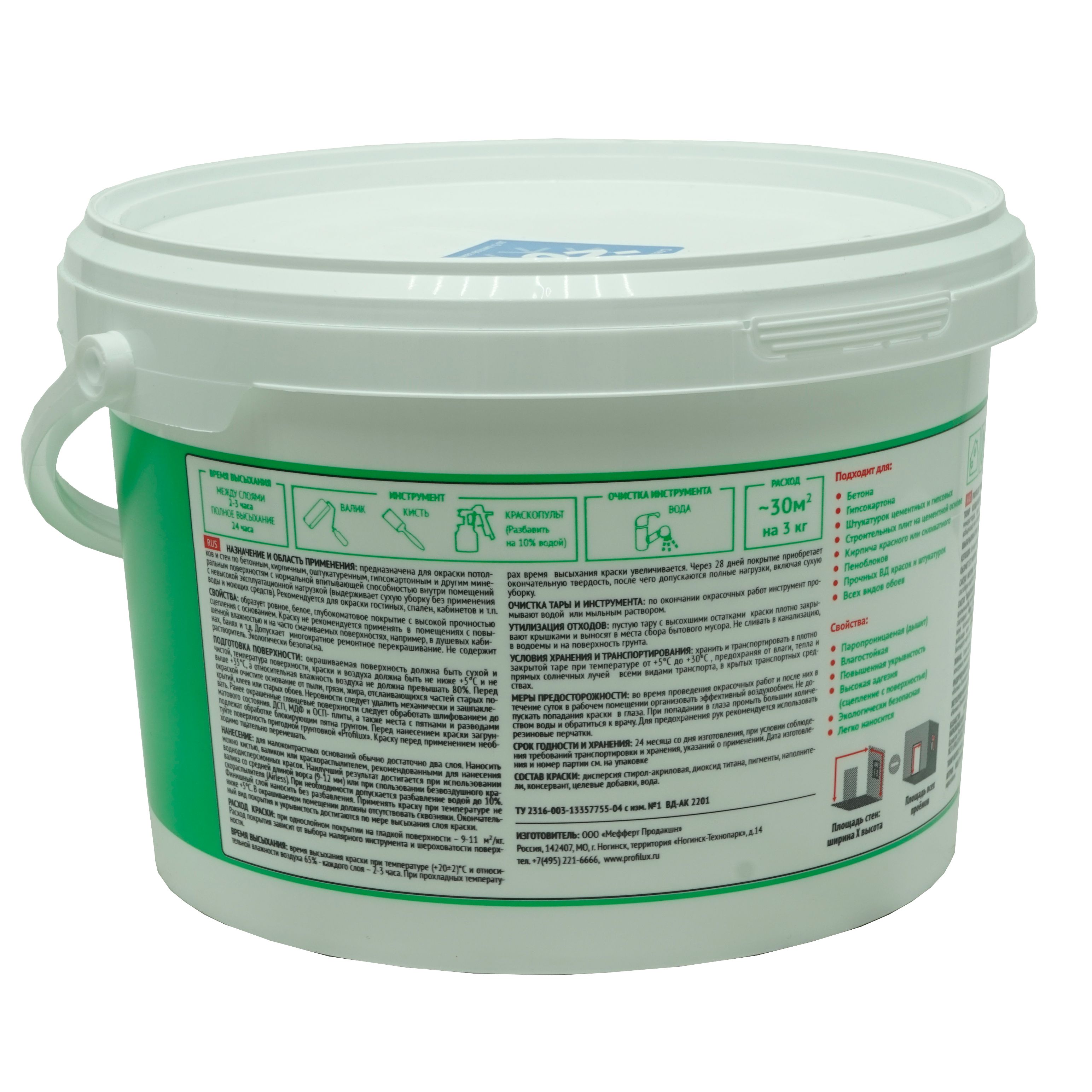Применяется для окраски стен и потолков в жилых и общественных зданиях, помещениях, не подвергающихся сильным эксплуатационным нагрузкам. Краска применяется на все виды минеральных оснований, включая асбестоцемент, газобетон, гипсовые штукатурки, гипсокартонные плиты, на старые, но еще прочные лакокрасочные покрытия.