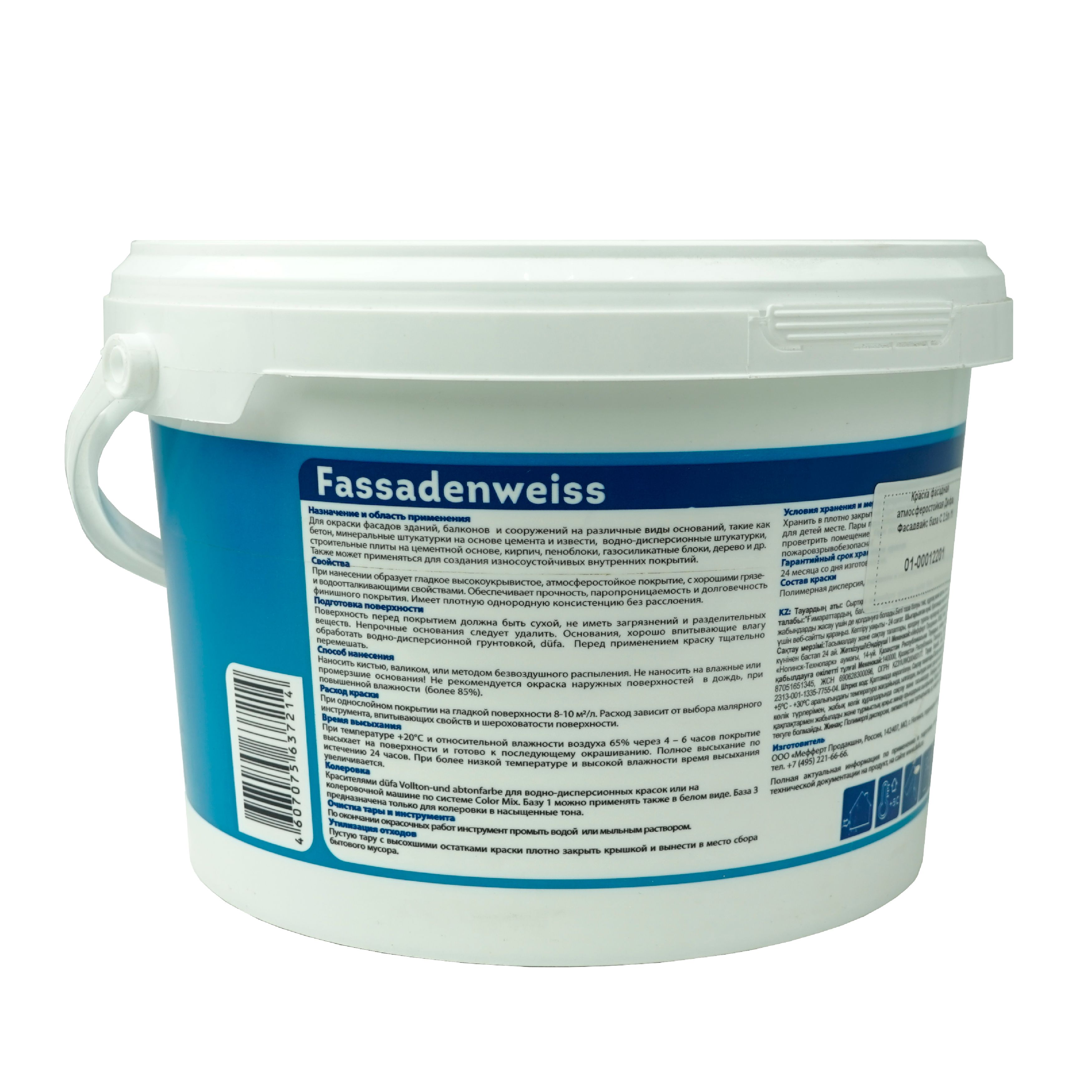 Краска фасадная атмосферостойкая Dufa FASSADENWEISS база А 2,5л цена - купить в Барнауле, Бийске. Размеры, характеристики, фото в интернет-магазине.