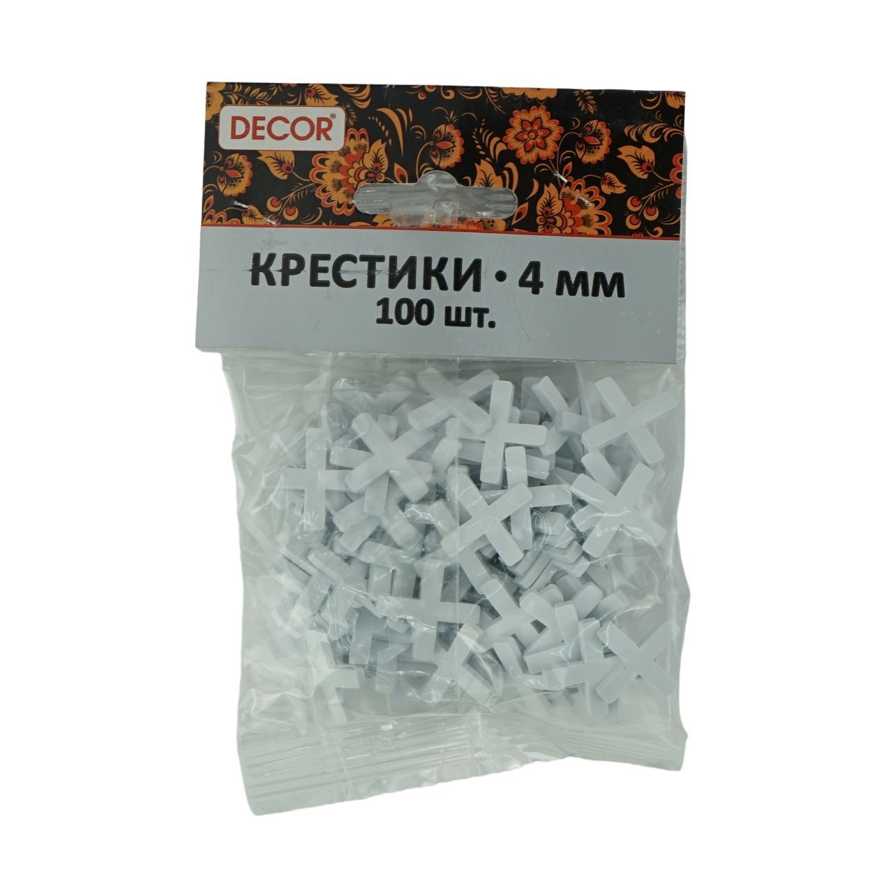 Крестики (DECOR) для кафельной плитки - четырехконечные полнотелые пластиковые крестики, толщиной ребра 4 мм, белого цвета, в упаковке по 100 шт, используются для ровной укладки облицовочной плитки на горизонтальные и вертикальные поверхности.