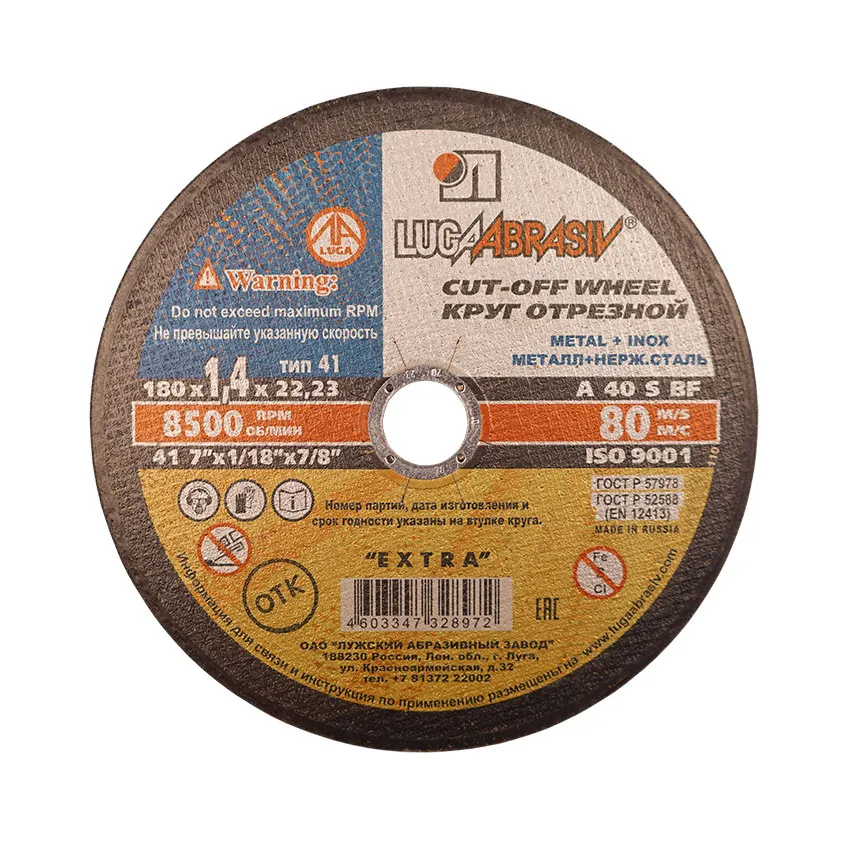 Круг отрезной абразивный ЛУГА по металлу 180х1,4х22 - расходный сменный элемент для УШМ изготовлен из электрокорунда нормального марки 14А на основе бакелитовой связки с армированием.
