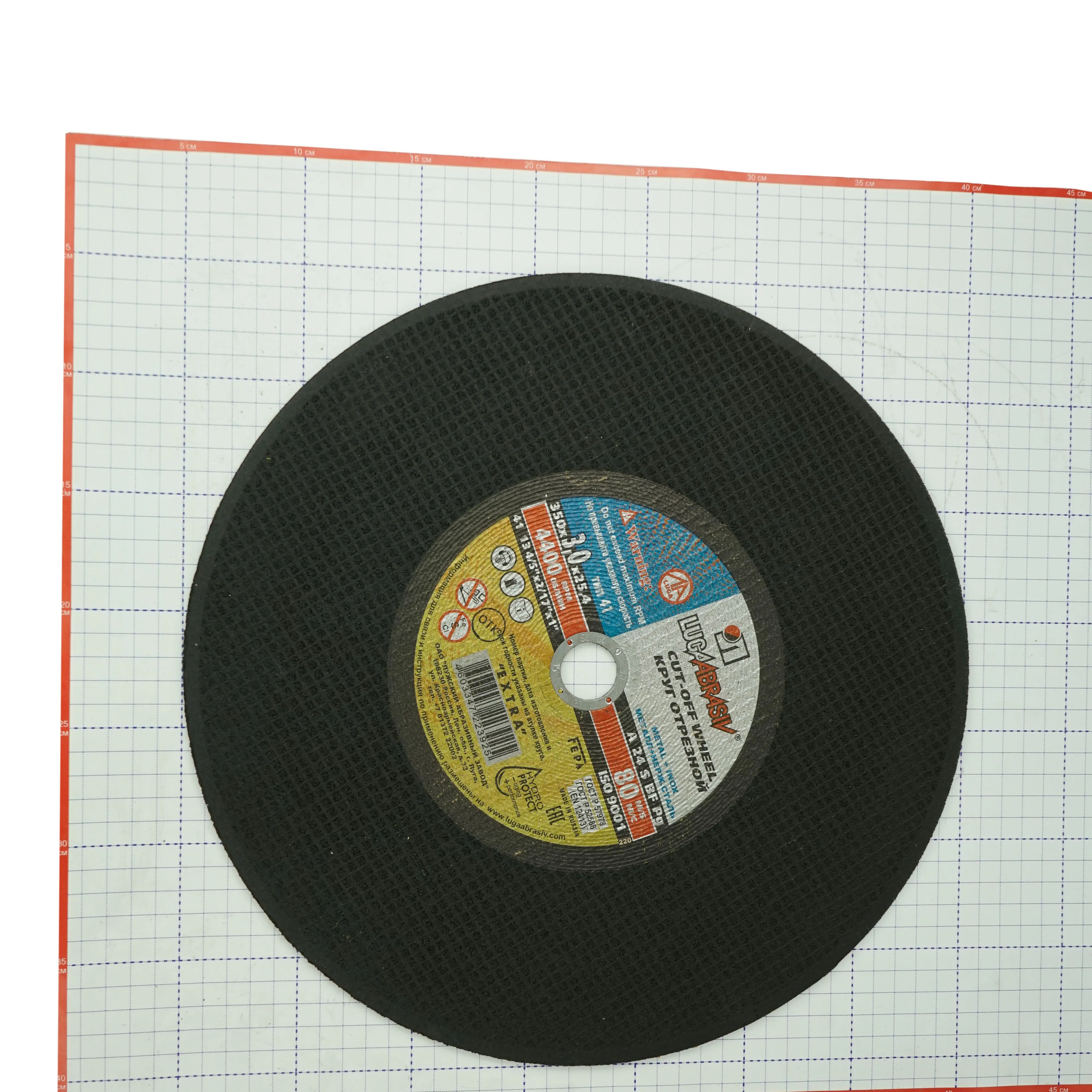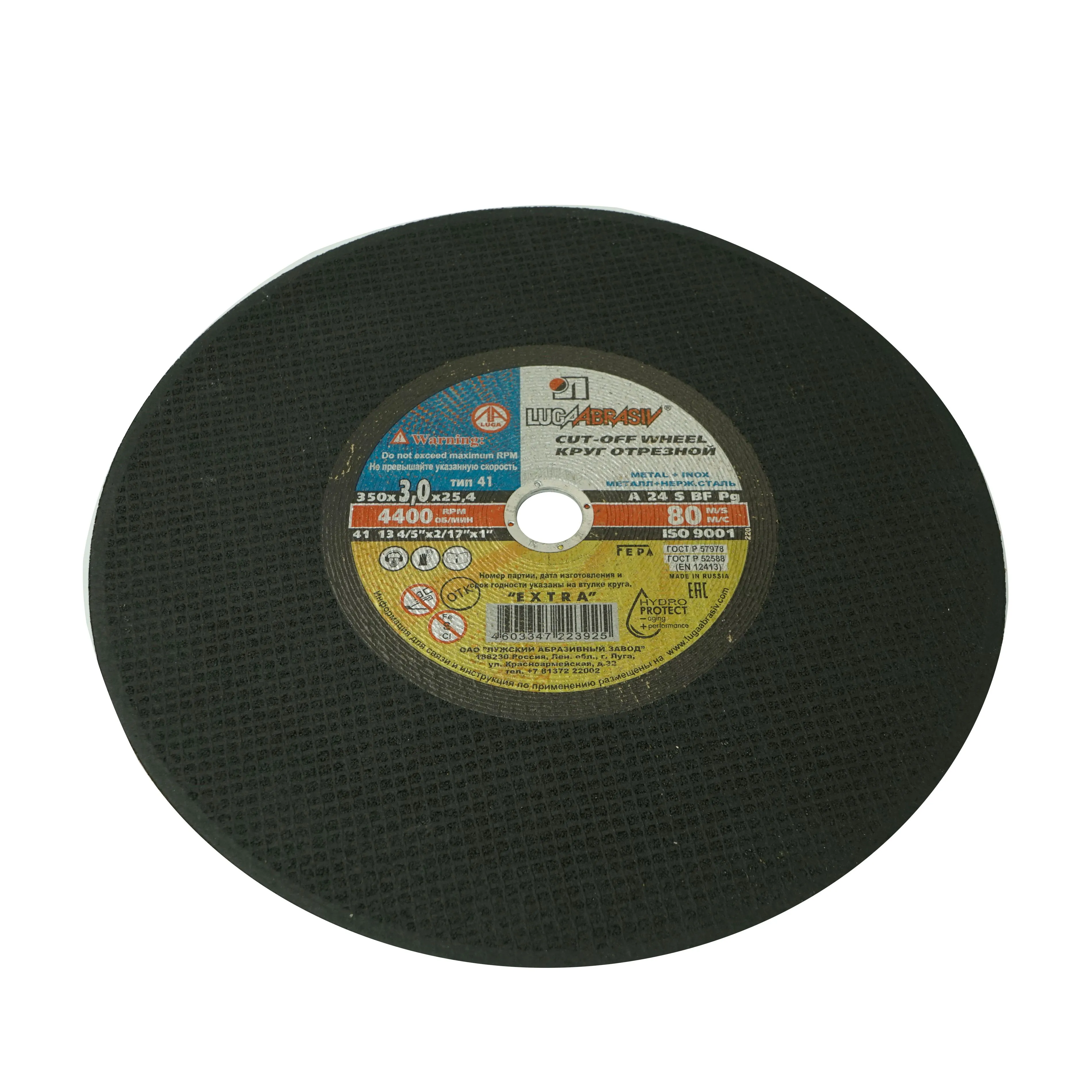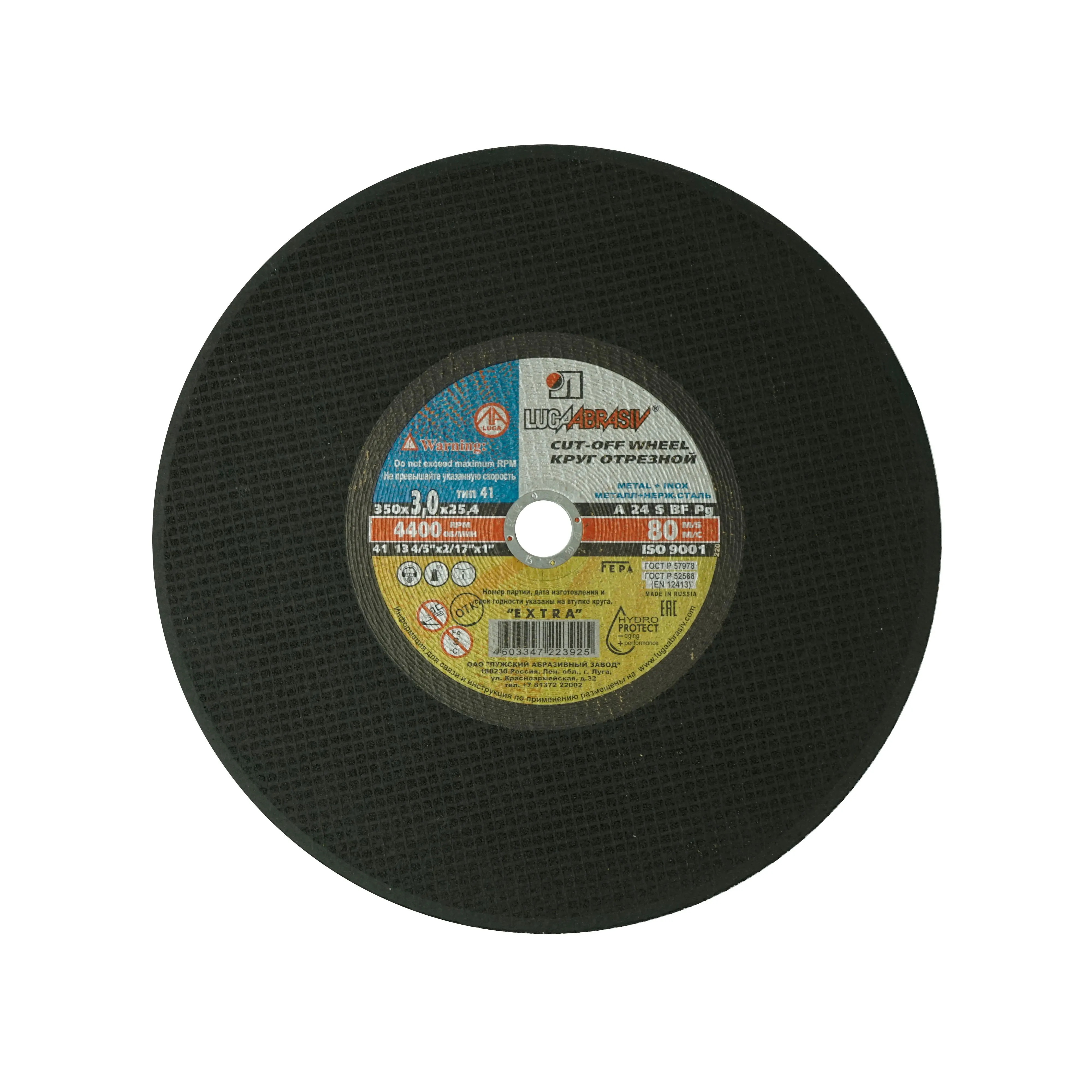 Круг отрезной абразивный ЛУГА по металлу 350х3х25,4- расходный сменный элемент для УШМ изготовлен из электрокорунда нормального марки 14А на основе бакелитовой связки с армированием.