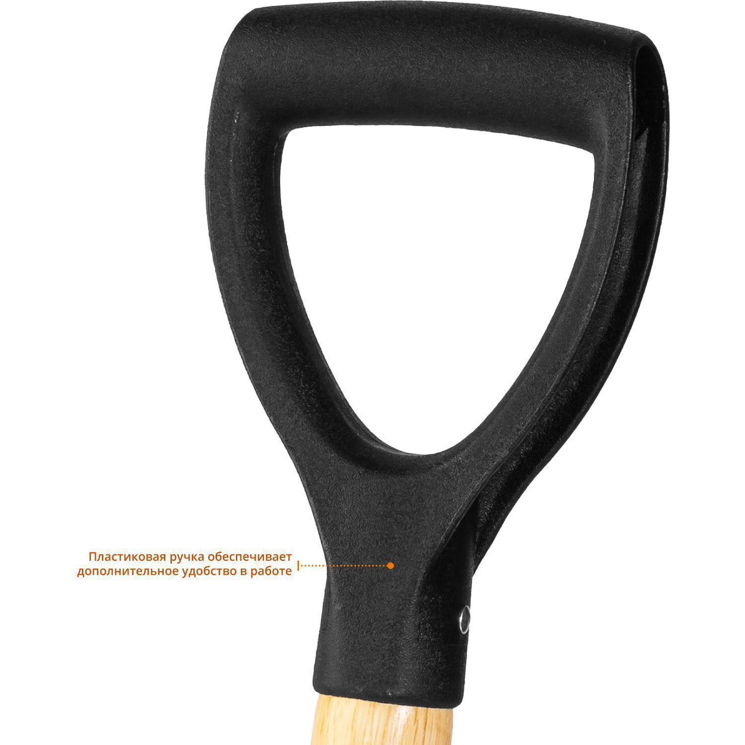 Эргономичная пластиковая рукоятка на черенке обеспечивает удобный хват.