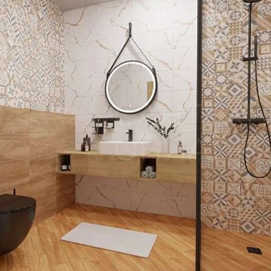 Marmaris сочетает в себе уютное дерево цвета капучино и холодный мрамор с коричневыми прожилками. Коллекцию украшает декафон со строгим шевроном, в котором полосы мрамора и дерева, напоминающие погоны, уложены «елочкой». Нейтральная расцветка обеспечивает спокойный фон для акцентных или контрастных деталей, а матовая поверхность «уравновешивает» пространство.
