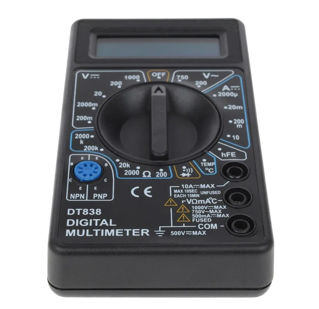 Мультиметр DT 838 - это цифровой многофункциональный измерительный прибор, также называемый универсальным тестером. С его помощью можно узнать значения сопротивления, напряжения и силы тока на участке цепи. Кроме того, можно проверить целостность электрической цепи и многие радиодетали, например, транзисторы или диоды. Функционально мультиметр заменяет несколько измерительных устройств: вольтметр, амперметр, омметр. Это очень удобно иметь компактное устройство, способное измерить практически всё.