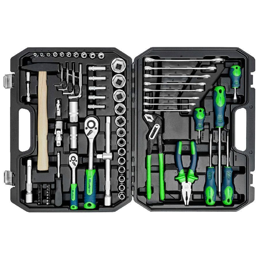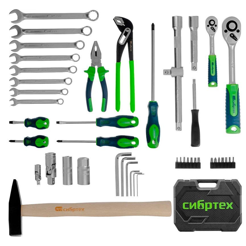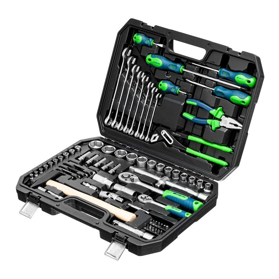 Набор инструментов Сибртех упакован в пластиковый кейс и состоит из 76 предметов с присоединительным размером 1/2" и 1/4". Инструменты предназначены для монтажа и демонтажа резьбового крепежа с разными типами шлицев, а также для ударных и других слесарно-монтажных работ. В комплект поставки входят карданы, удлинители и переходники, облегчающие работу в труднодоступных местах. Набор используется для ремонта автомобилей, а также полезен в быту.
