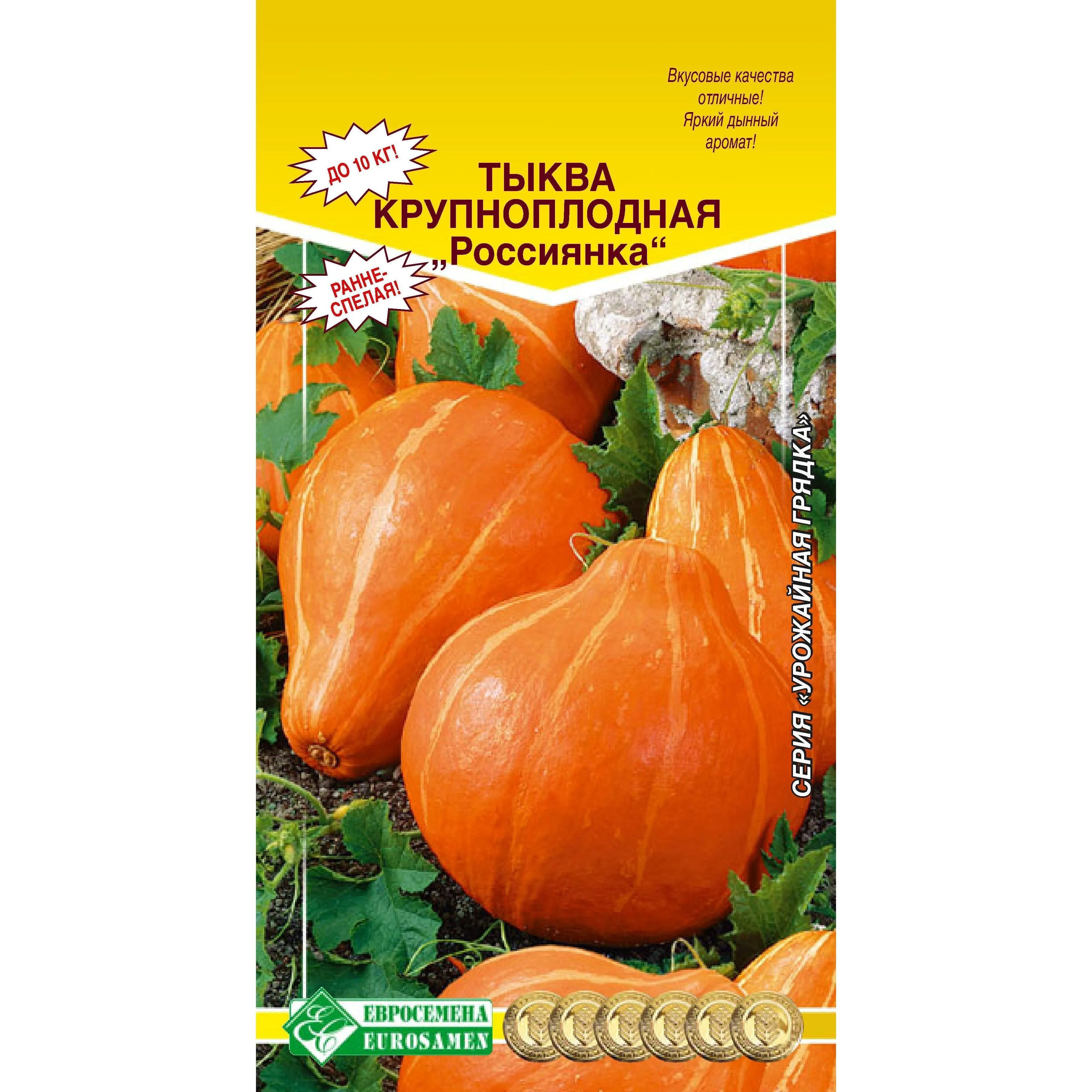 Тыква крупноплодная Россиянка – раннеспелый (90-100 дней) холодостойкий сорт, предназначенный для потребления в свежем виде и переработки. Подходит для выращивания на открытом грунте и в ЛПХ. Основная плеть средней длины с 3-4 боковыми плетями. Листья средних размеров, зеленые, слаборассеченные. Плоды чалмовидные, с выпуклой вершиной, гладкий, красно-оранжевый. Средняя масса 1,2-1,9 килограмм (до 10 кг). Имеет оранжевую, толстую (4-6 сантиметров), плотную, мякоть с дынным ароматом. Отлично хранится в зимой.