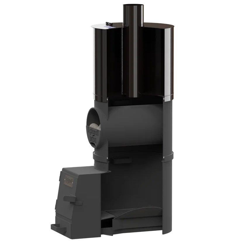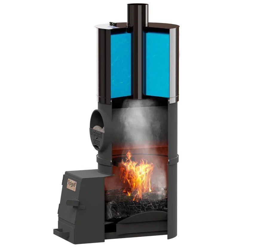 Банная печь трехкомпонентная, изготовлена из трубы 426*6…8, С ВЫНОСНОЙ ТОПКОЙ. Водогрейный бак на 55 литров из ЧЕРНОГО МЕТАЛЛА (полимерное покрытие). Топливо – дрова, уголь. Предназначена для отапливания парильного и смежных помещений бани, получения пара и нагрева воды.