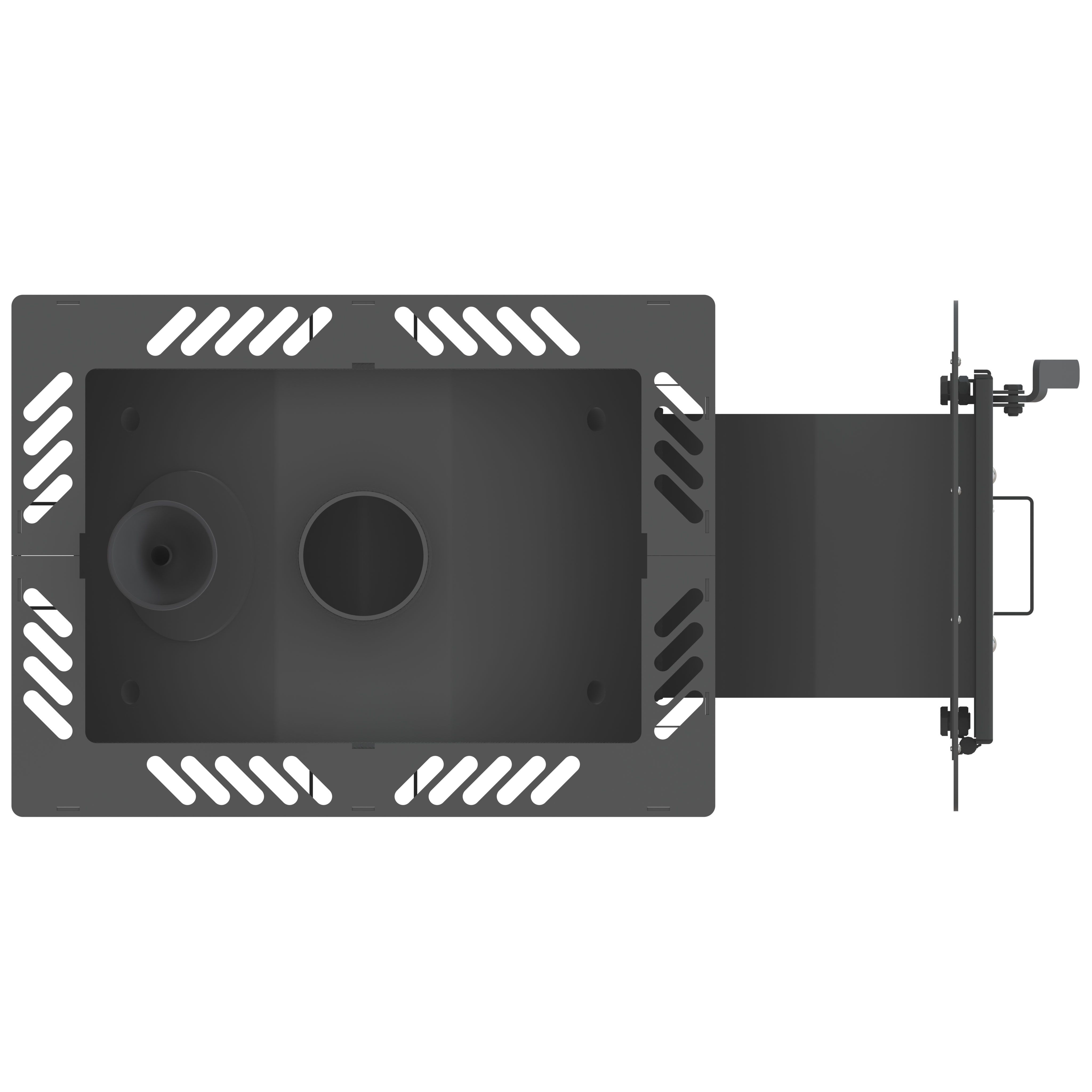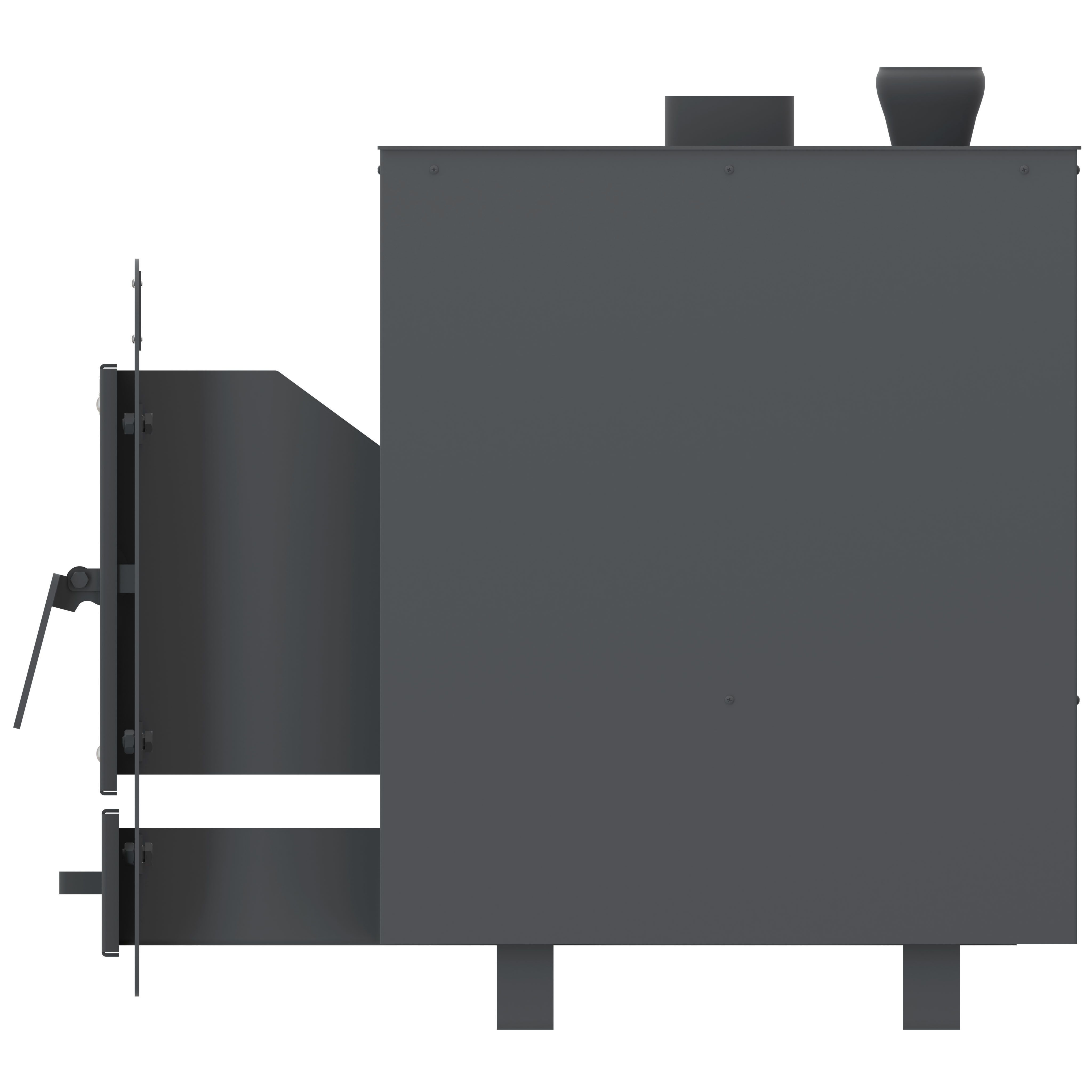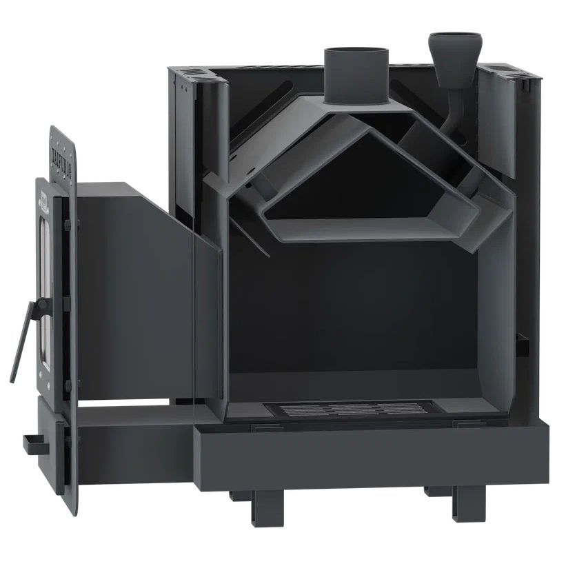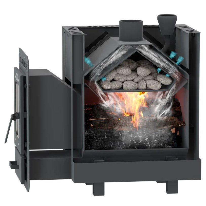Банная печь с закрытой (сухой пар) и открытой каменками. Изготовлена из стали толщиной 5 мм, с конвекционным кожухом. Диаметр дымохода 115 мм. Дверка топки с панорамным стеклом.
