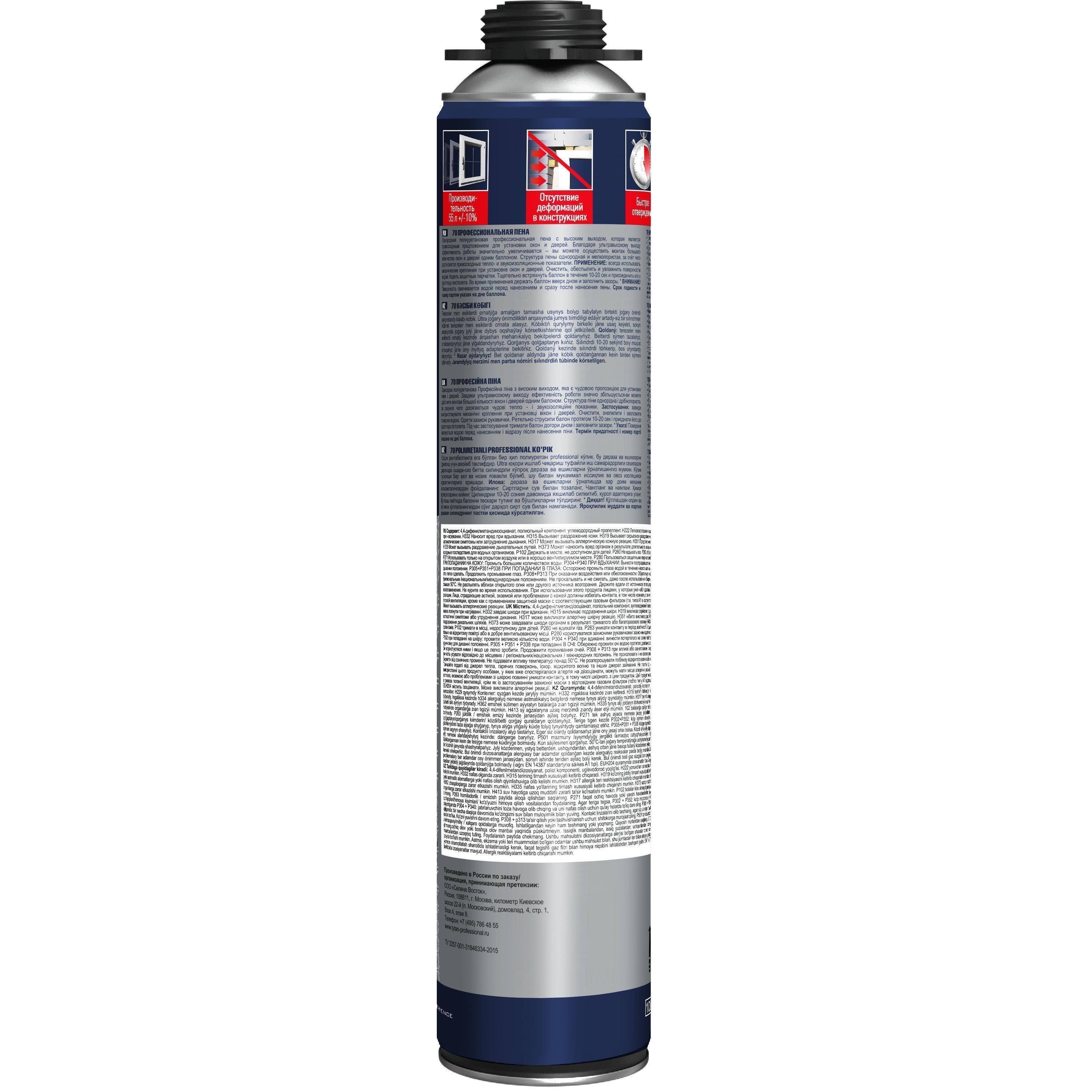 Пена профессиональная TYTAN Professional 70. Благодаря ультравысокому выходу эффективность работы значительно увеличивается – вы можете осуществить монтаж большего количества окон и дверей одним баллоном. Структура пены однородная и мелкопористая, за счёт чего достигаются превосходные тепло- и звукоизоляционные показатели.