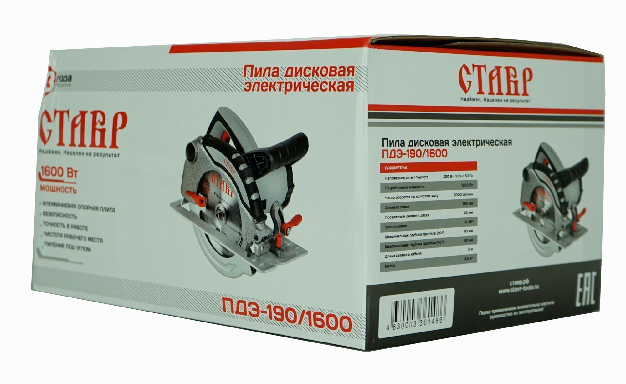 Электропила дисковая СТАВР 1600 Вт, d 190х20мм, 5000об/мин, глубина 63мм, ПДЭ-190/1600.