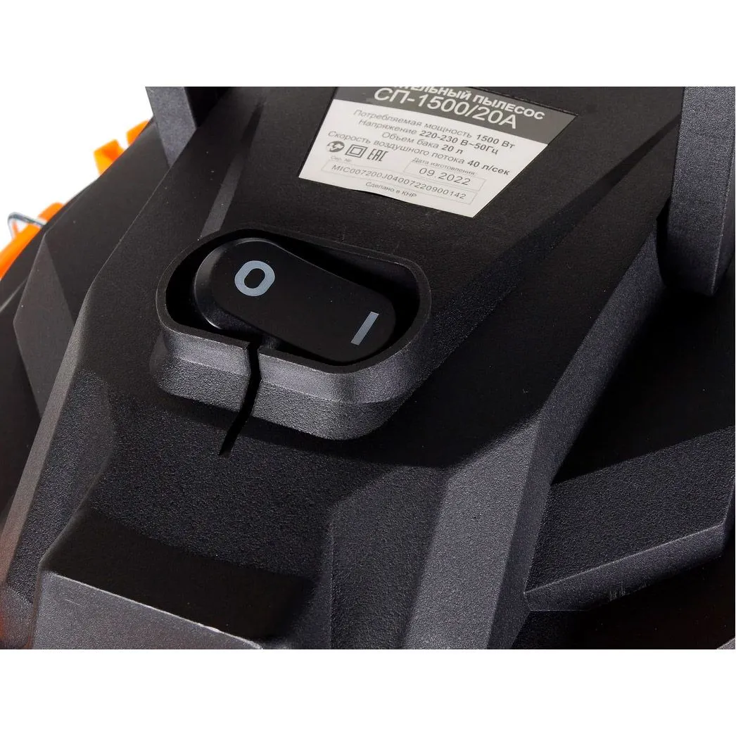 - Нержавеющий корпус бака строительный пылесос СП-1500/20А Вихрь гарантирует долговечность и стойкость к коррозии.