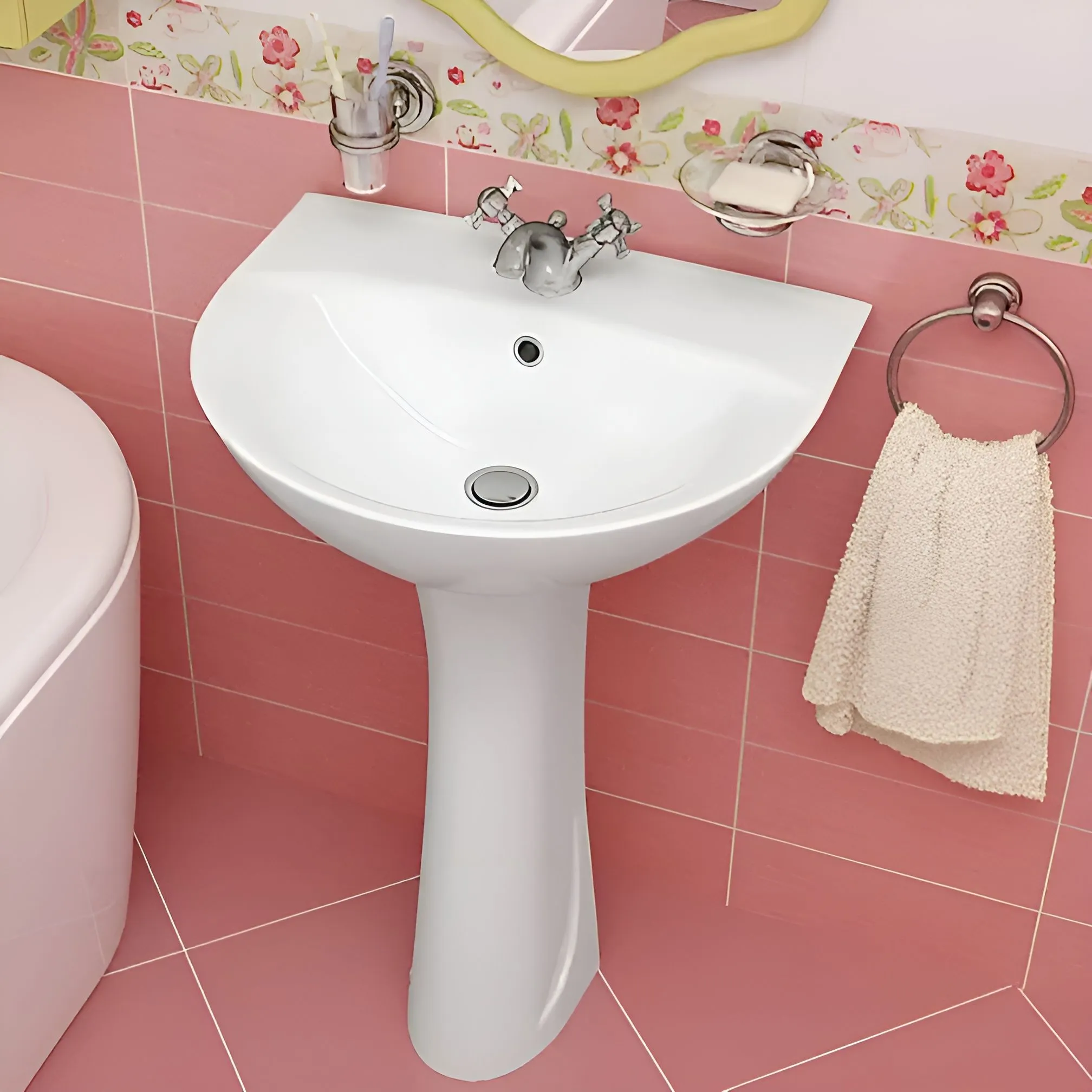 Элегантный силуэт унитаза-компакта гармонирует с округлой раковиной с пьедесталом, подчеркивая неповторимость и изысканность интерьера ванной комнаты.