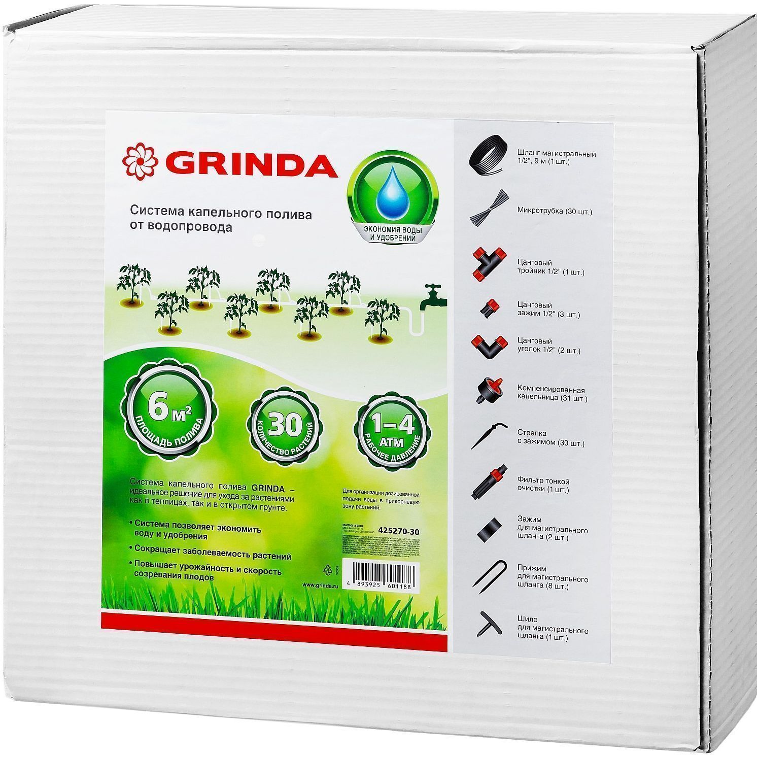 Система капельного полива от водопровода GRINDA 30 растений 425270-30 необходима для организации капельного орошения в открытом грунте или теплице.