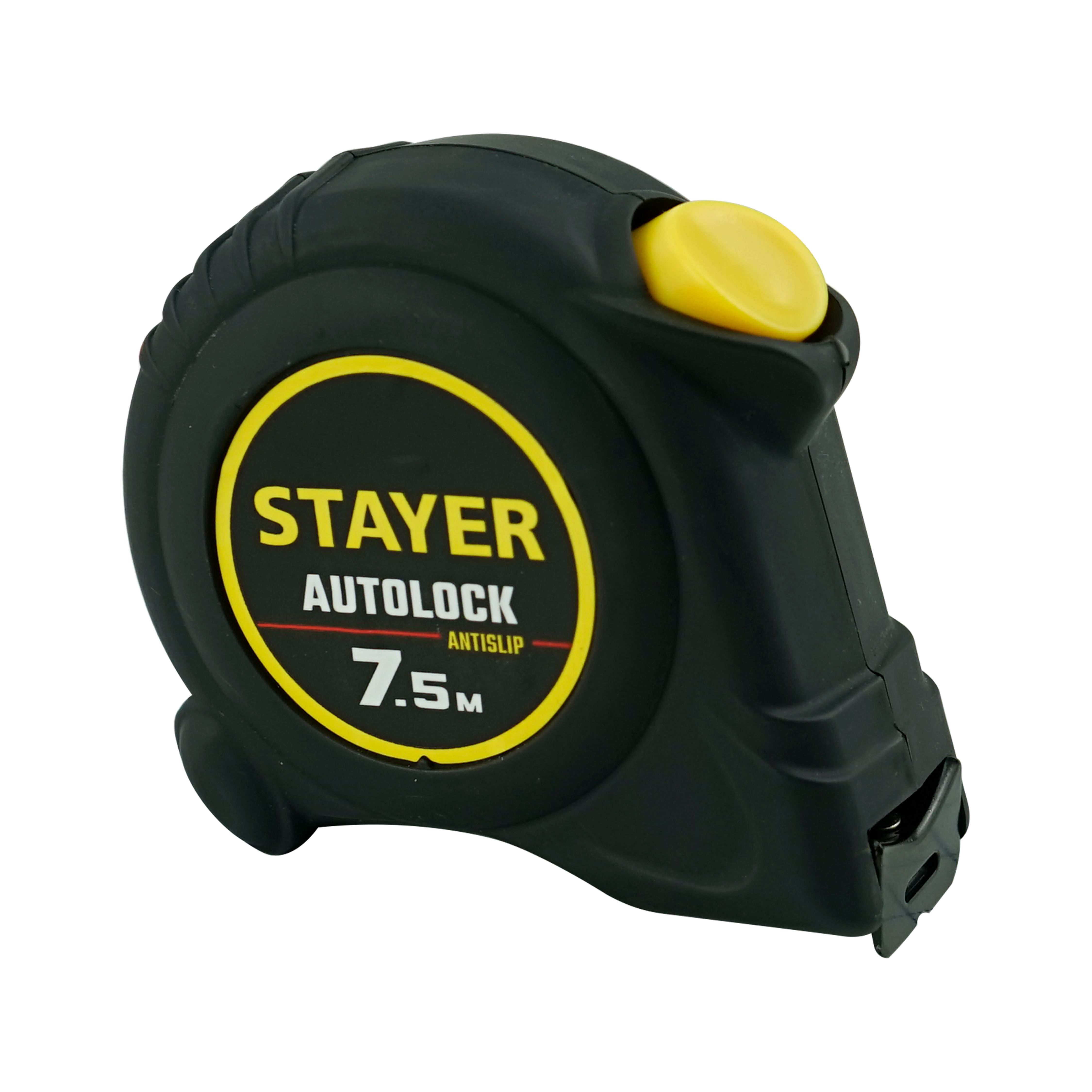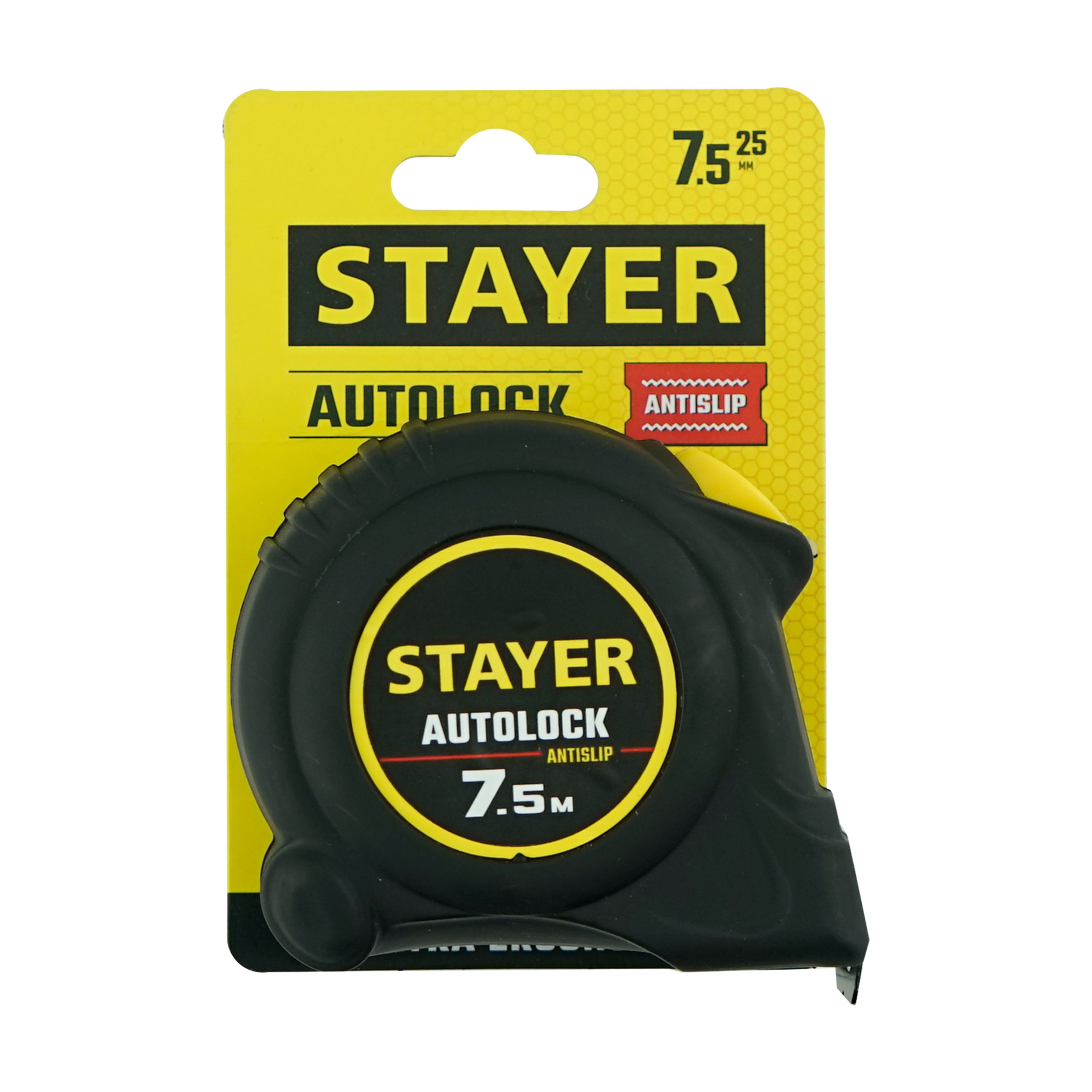Рулетка Мастер аутлок STAYER, 7мх25мм (2-34126-07-25) с автоматической фиксацией полотна для повышения удобства измерений.