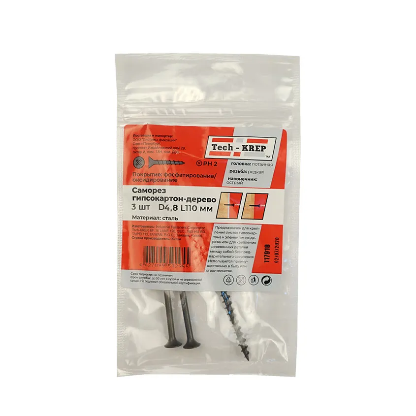 Саморез ШСГД 4,8х110мм - стальной крепежный элемент, фосфатированный, с острым наконечником, потайной головкой, крестообразной формой шлица Ph2, крупной резьбой, черного цвета