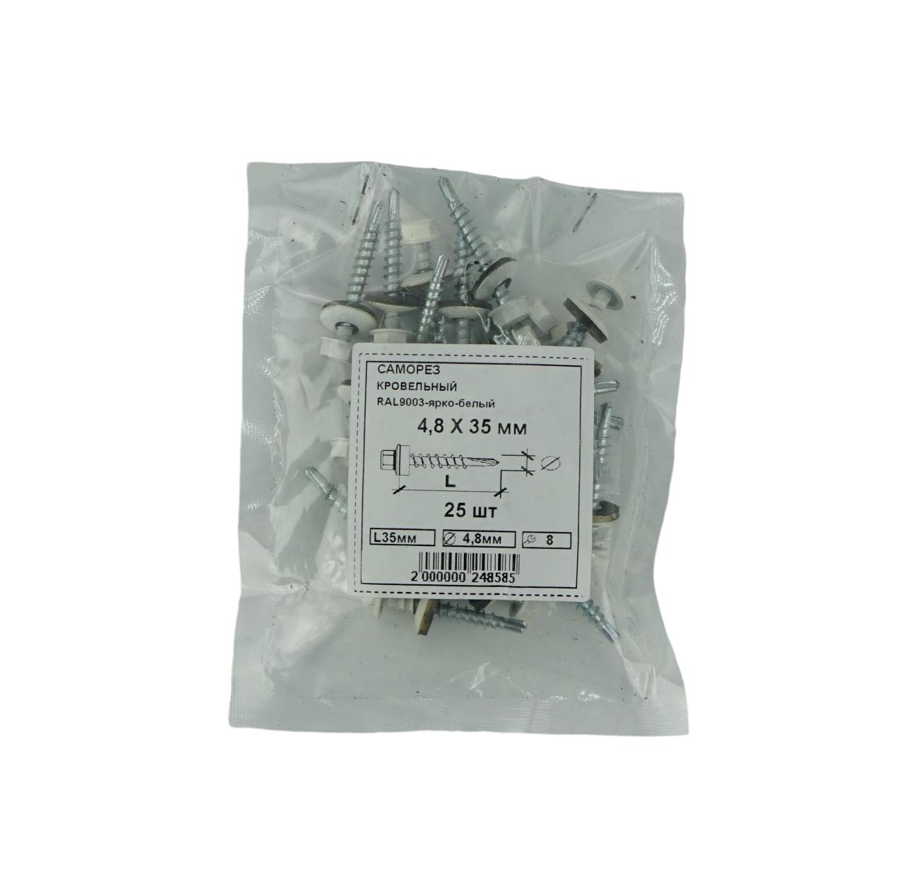 Саморезы кровельные RAL-9003 ярко-белый 4,8х35мм - стальные саморезы с шестигранной головкой и со сверловидным наконечником, укомплектованные шайбой с резиновой прокладкой. Производятся из оцинкованной стали, имеют полную резьбу.