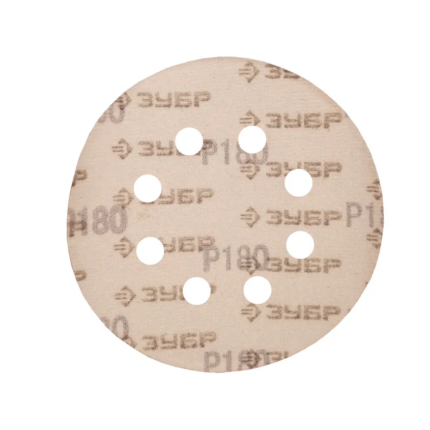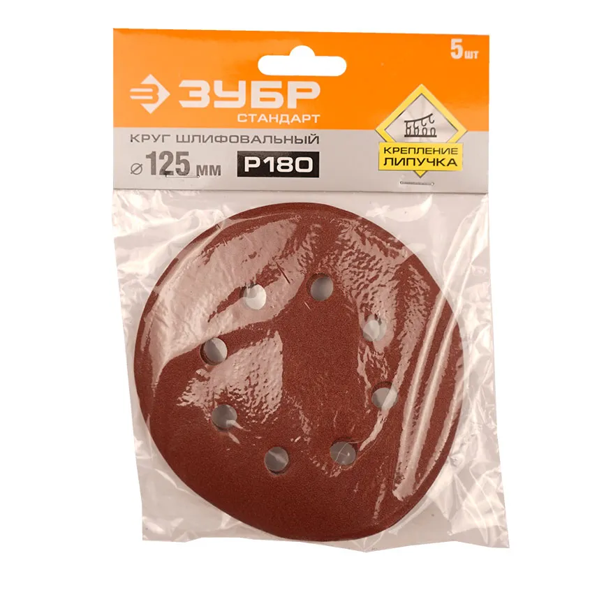 Шлифовальный круг диаметром 125мм от производителя Зубр. Крепится к инструменту при помощи велкро-основы (липучки). Изготовлен на бумажной основе, в качестве абразива использован электрокорунд нормальный. Зернистость Р180 предназначена для финишных работ.