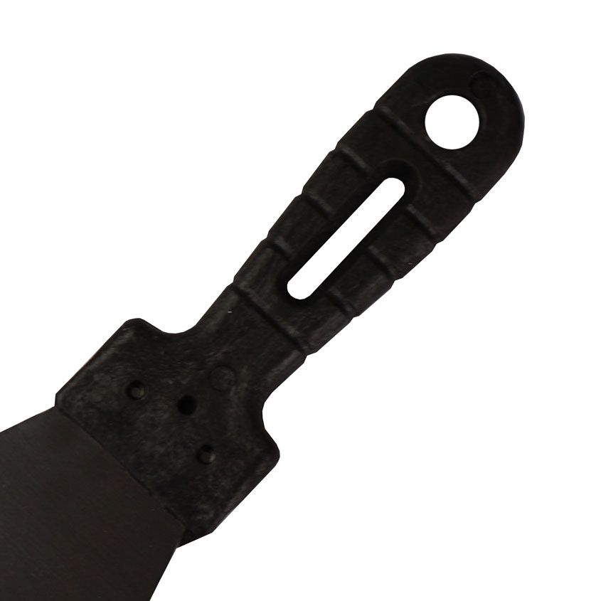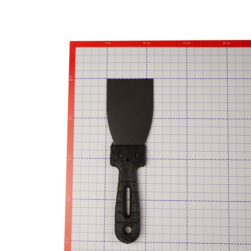 Профилированное полотно шпателя изготовлено из высокоуглеродистой нержавеющей стали, прошедшей специальную термическую обработку для придания ей свойств «памяти» (при изгибе лезвие принимает исходное положение). Пластмассовая рукоятка надежно скреплена с полотном и оснащена отверстием для подвески.