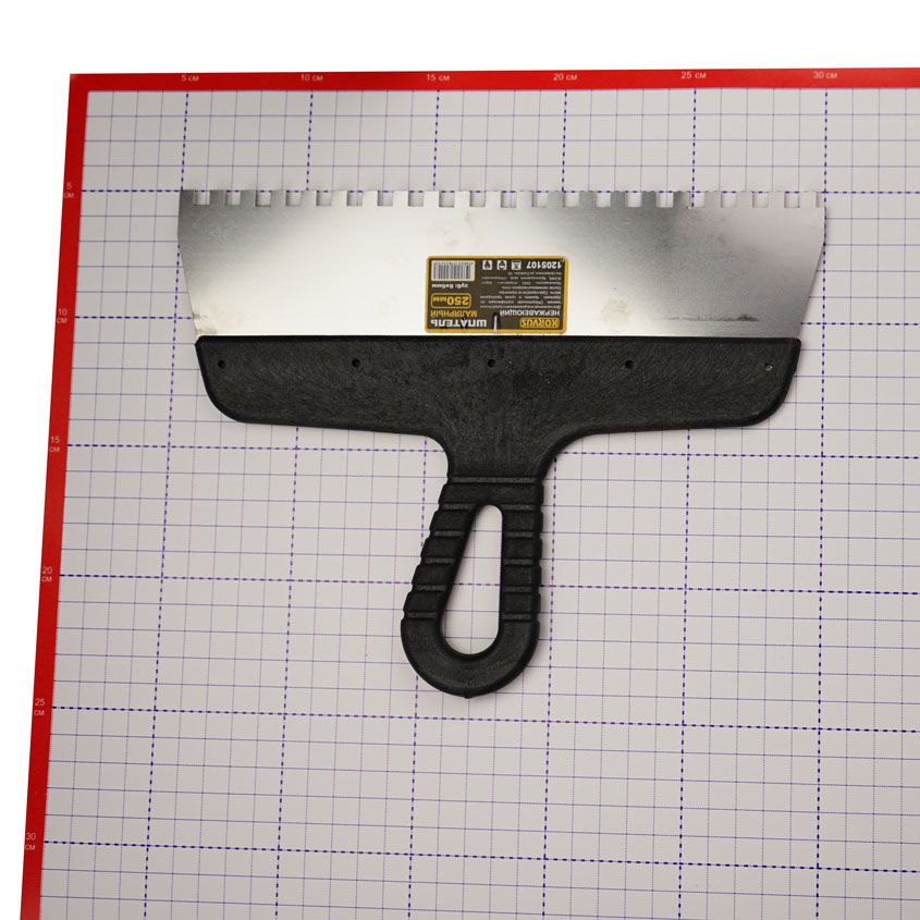 Применяется для равномерного нанесения на различные поверхности клеевых растворов, иных отделочных материалов и их последующего разравнивания с образованием борозд.