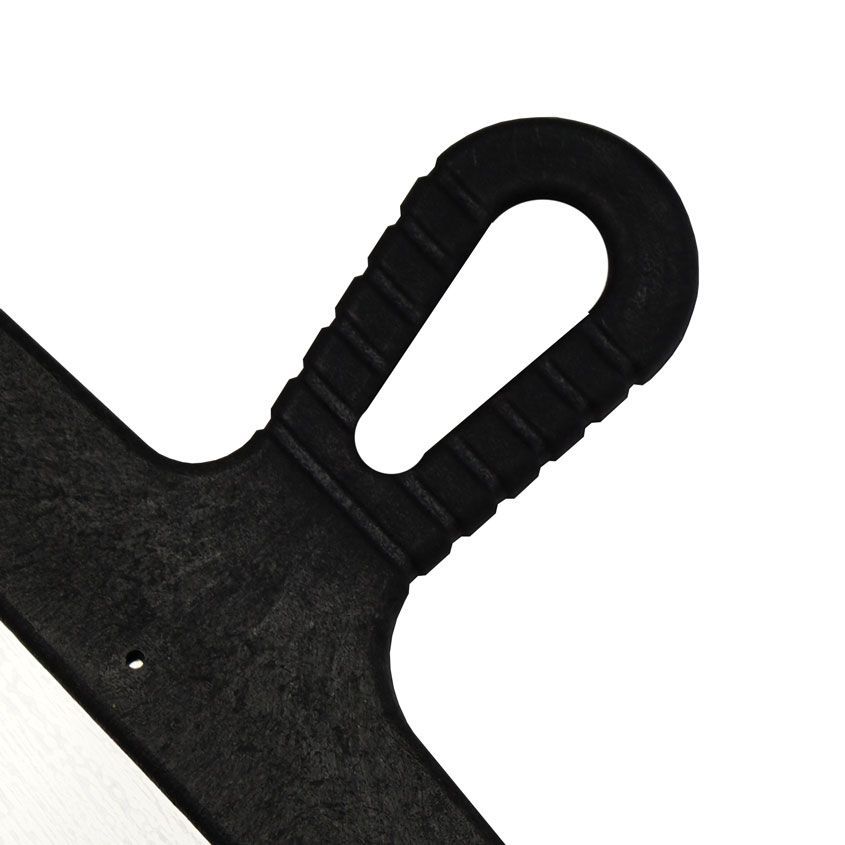 Полотно шпателя изготовлено из нержавеющей стали. Пластмассовая рукоятка надежно скреплена с полотном и оснащена отверстием для подвески.