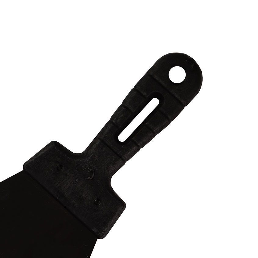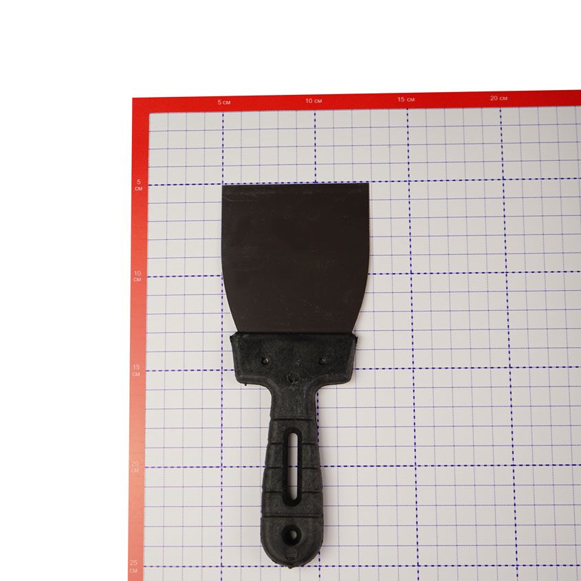 Профилированное полотно шпателя изготовлено из высокоуглеродистой нержавеющей стали, прошедшей специальную термическую обработку для придания ей свойств «памяти» (при изгибе лезвие принимает исходное положение). Пластмассовая рукоятка надежно скреплена с полотном и оснащена отверстием для подвески.