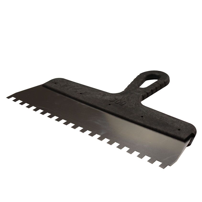 Шпатель (Корвус) фасадный зубчатый, пластмассовая ручка, 300мм, зуб 8х8мм - ручной инструмент, который применяется в отделочных и строительных работах. В основном необходим для нанесения и разравнивания клеевой смеси на основание, для дальнейшего приклеивания кафеля, натурального камня или керамической плитки. При помощи данного инструмента мастера своего дела декорируют поверхности нанесением слоя шпатлевки, создавая волны, круги, восьмерки, придавая фактурный узор стен и перфорируют старые обои. Благодаря конструктивной особенности зубчатого шпателя состав клея однородно распределяют по поверхности, не считая надобность удаления излишков клея.