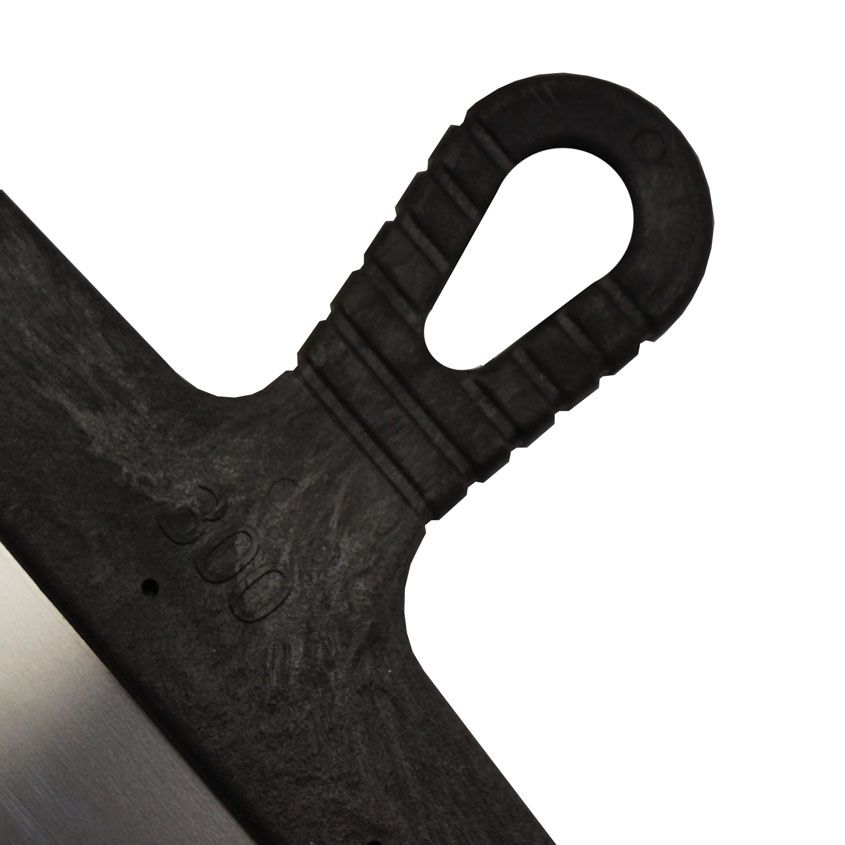 Полотно шпателя изготовлено из нержавеющей стали. Пластмассовая рукоятка надежно скреплена с полотном и оснащена отверстием для подвески.