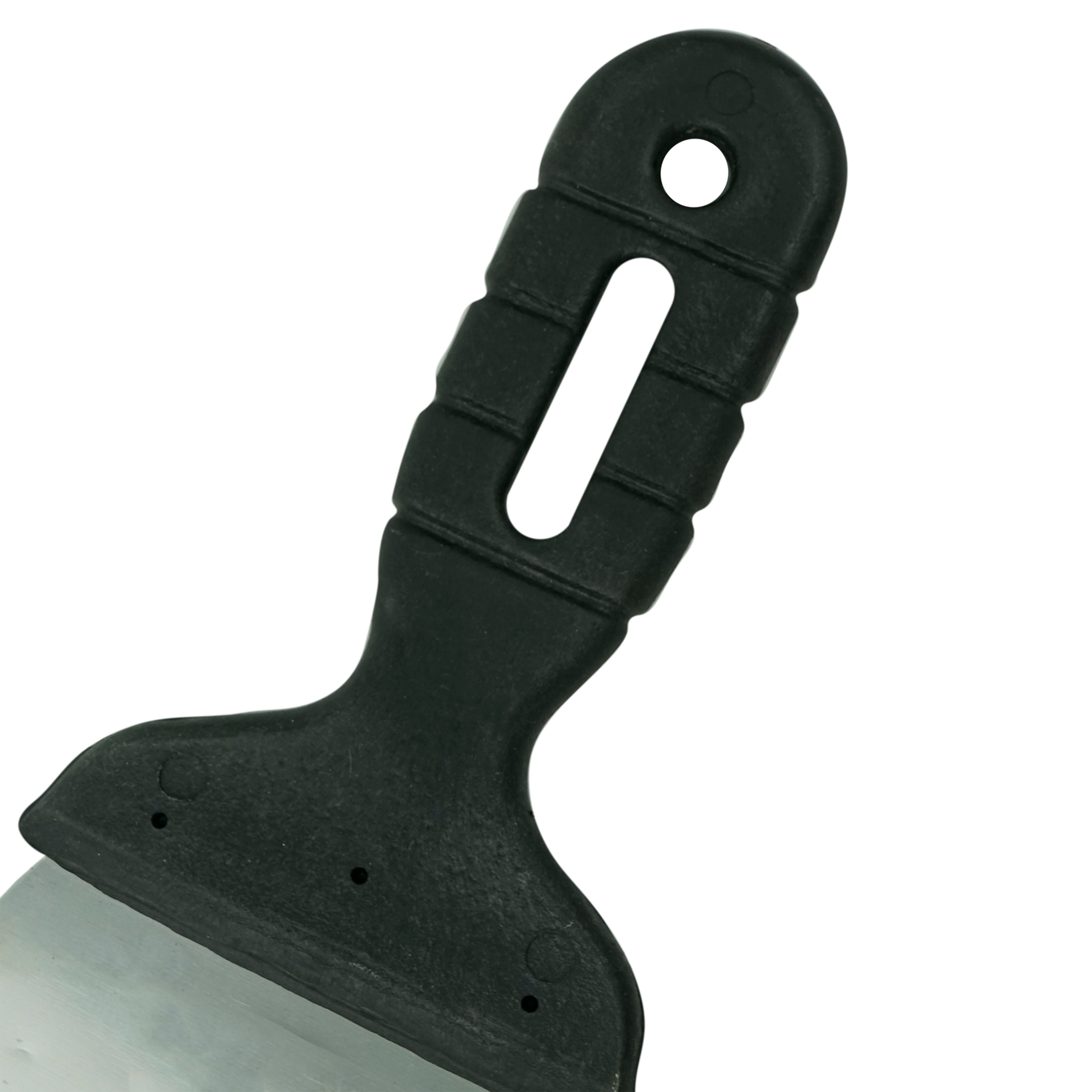 Профилированное полотно шпателя изготовлено из высокоуглеродистой нержавеющей стали, прошедшей специальную термическую обработку для придания ей свойств «памяти» (при изгибе лезвие принимает исходное положение). Пластмассовая рукоятка надежно скреплена с полотном и оснащена отверстием для подвески.
