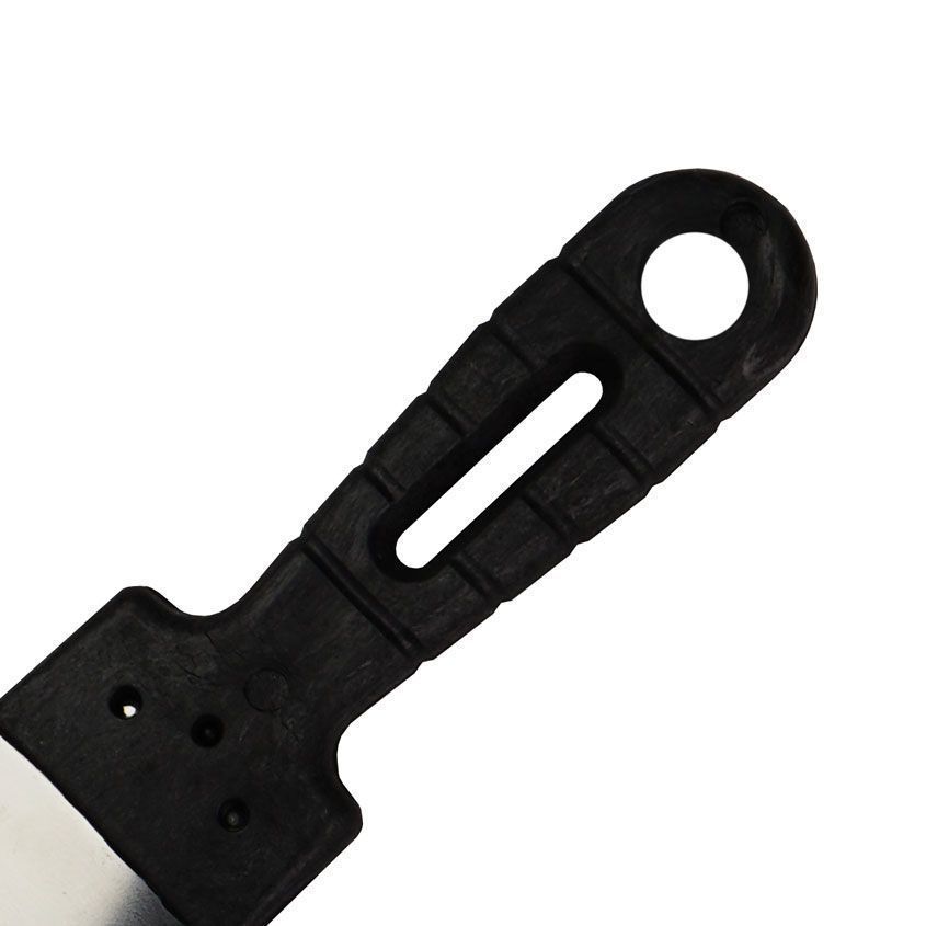 Профилированное полотно шпателя изготовлено из высокоуглеродистой нержавеющей стали, прошедшей специальную термическую обработку для придания ей свойств «памяти» (при изгибе лезвие принимает исходное положение). Пластмассовая рукоятка надежно скреплена с полотном и оснащена отверстием для подвески.