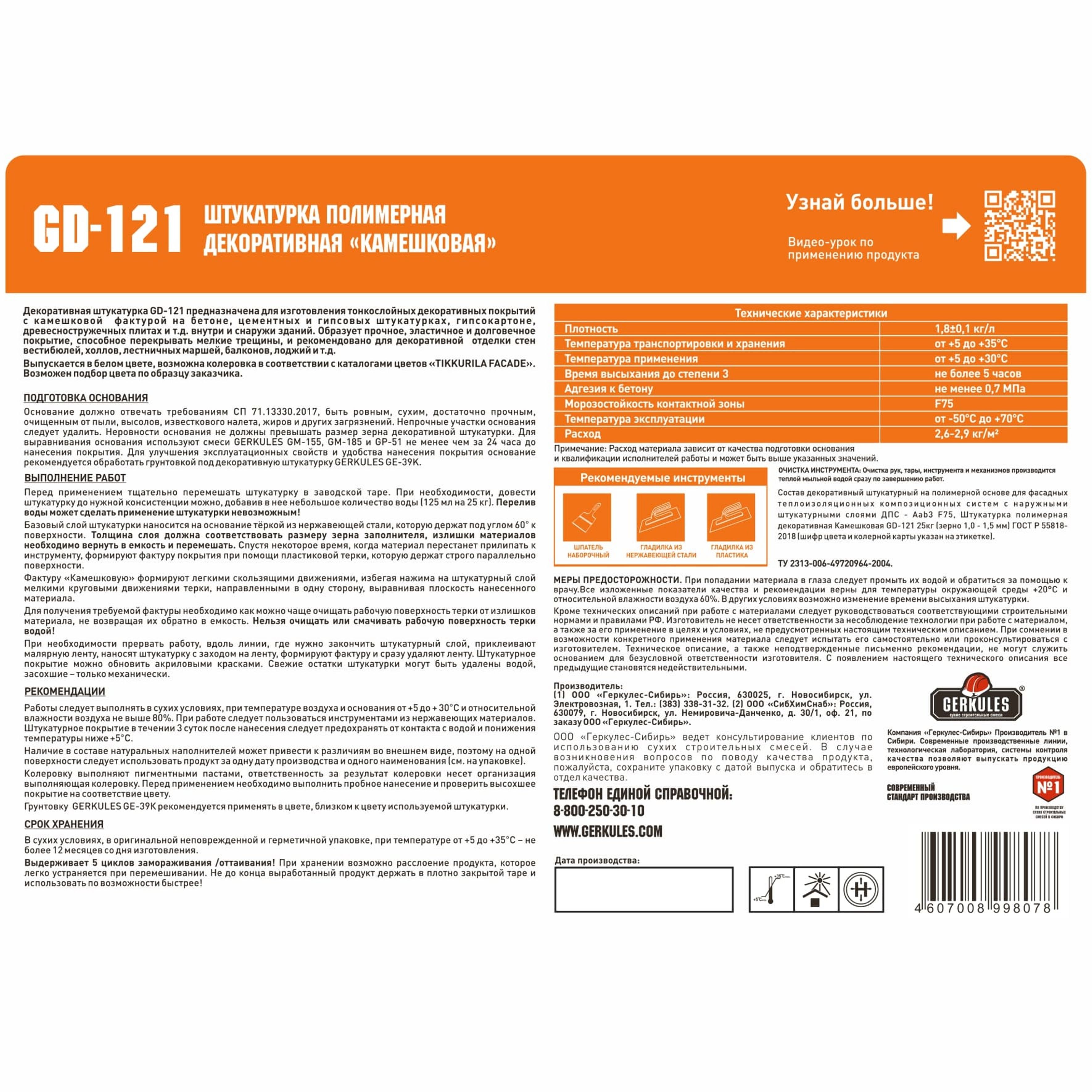 Декоративная полимерная штукатурка ГЕРКУЛЕС Камешковая GD-121 представляет собой жидкую смесь белого цвета на основе водной дисперсии акриловых сополимеров с добавлением пигментов, минеральных наполнителей и модифицирующих компонентов.