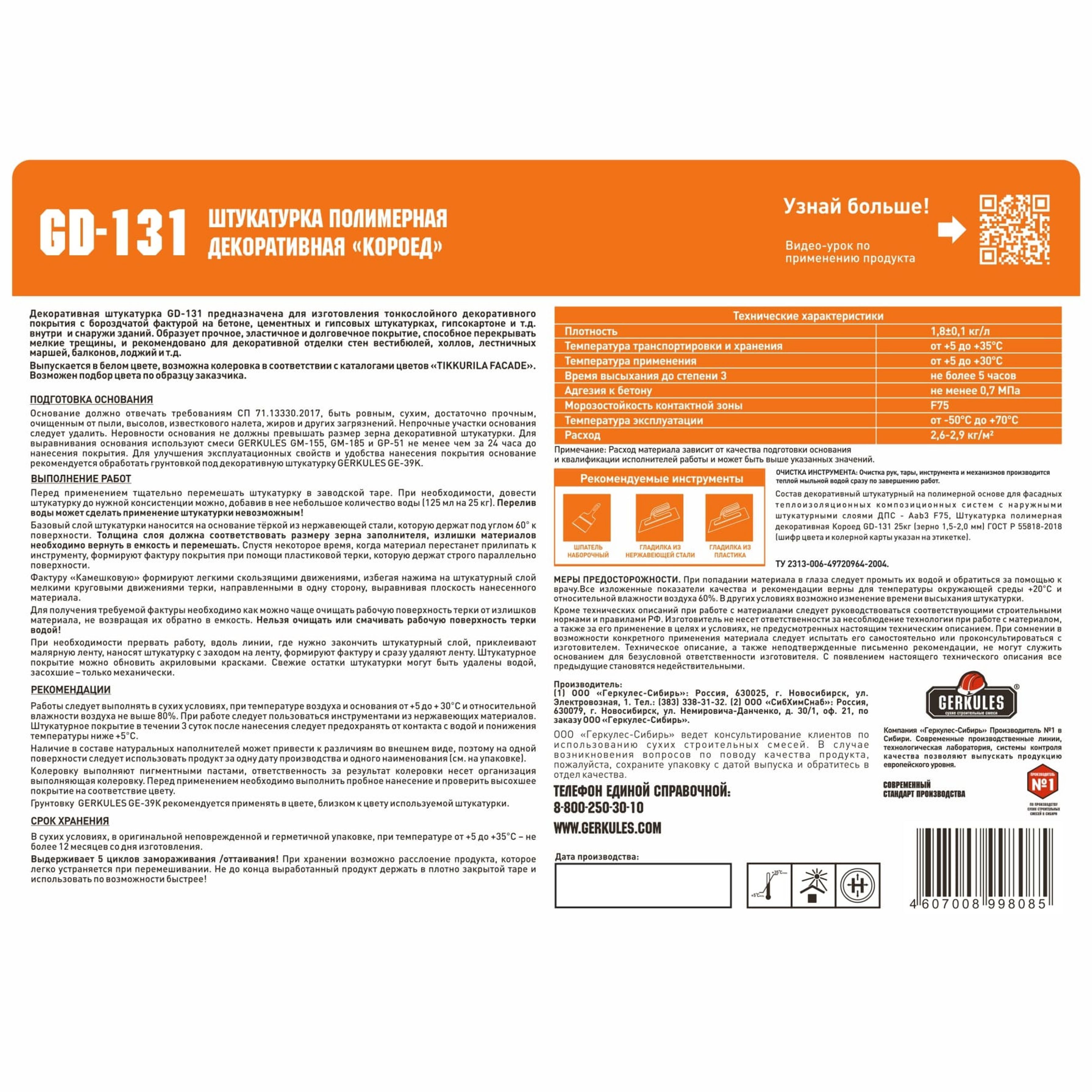 Декоративная полимерная штукатурка ГЕРКУЛЕС Короед GD-131 – представляет собой жидкую смесь белого цвета на основе водной дисперсии акриловых сополимеров с добавлением пигментов, минеральных наполнителей и модифицирующих компонентов.