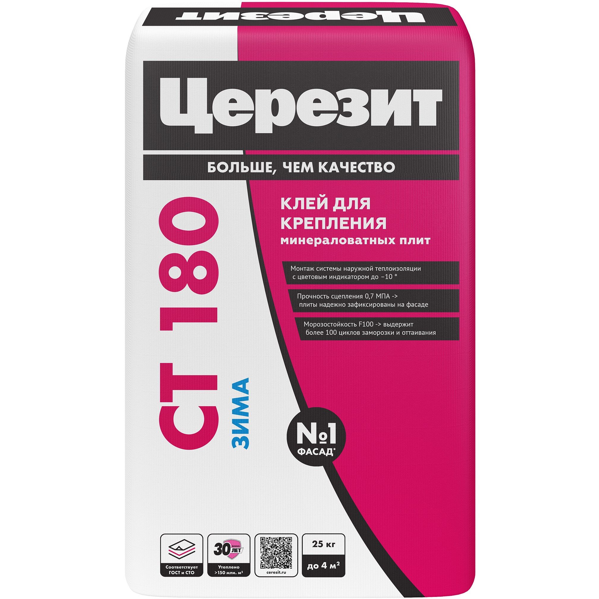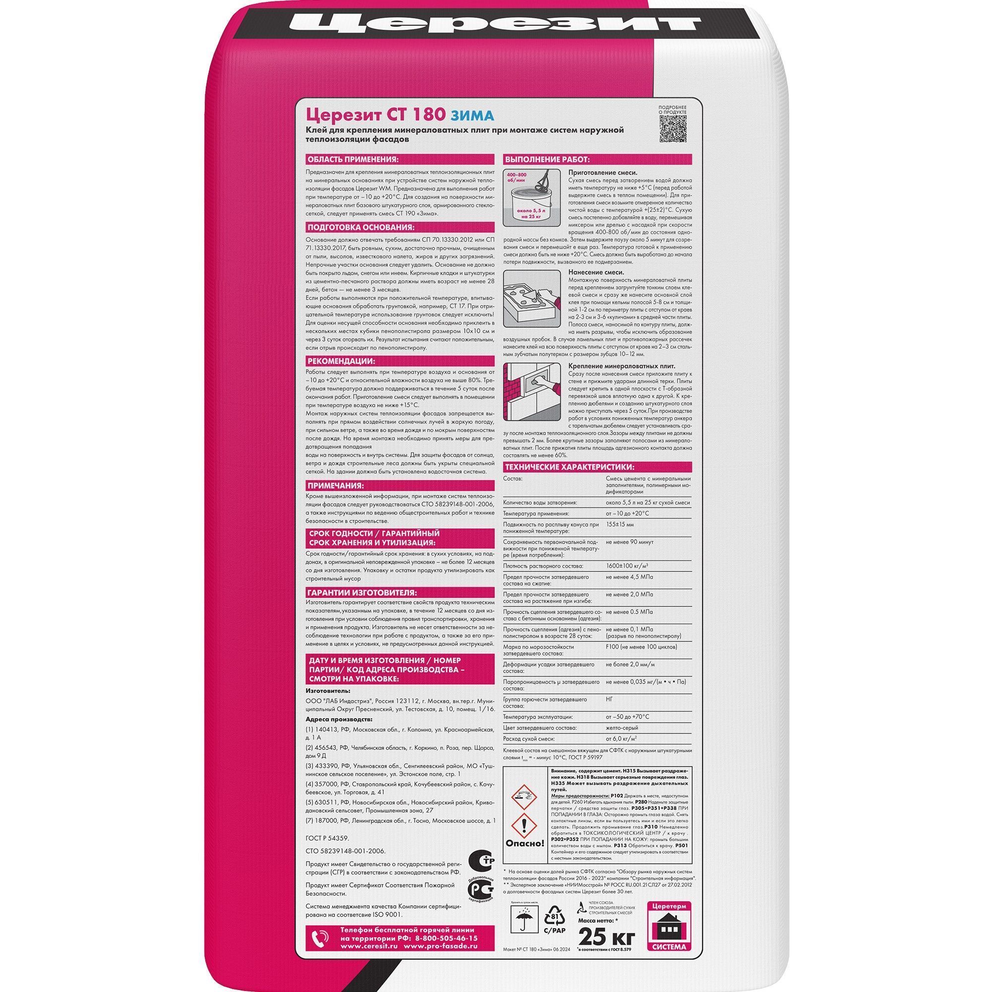Штукатурно-клеевая смесь Ceresit CT 180 производится из смеси цемента, полимерных модификаторов и минеральных наполнителей. Применяется для крепления плит из минеральной ваты и создания базового штукатурного слоя при наружной теплоизоляции фасадов. Материал обладает высокой адгезией и содержит армирующие микроволокна.