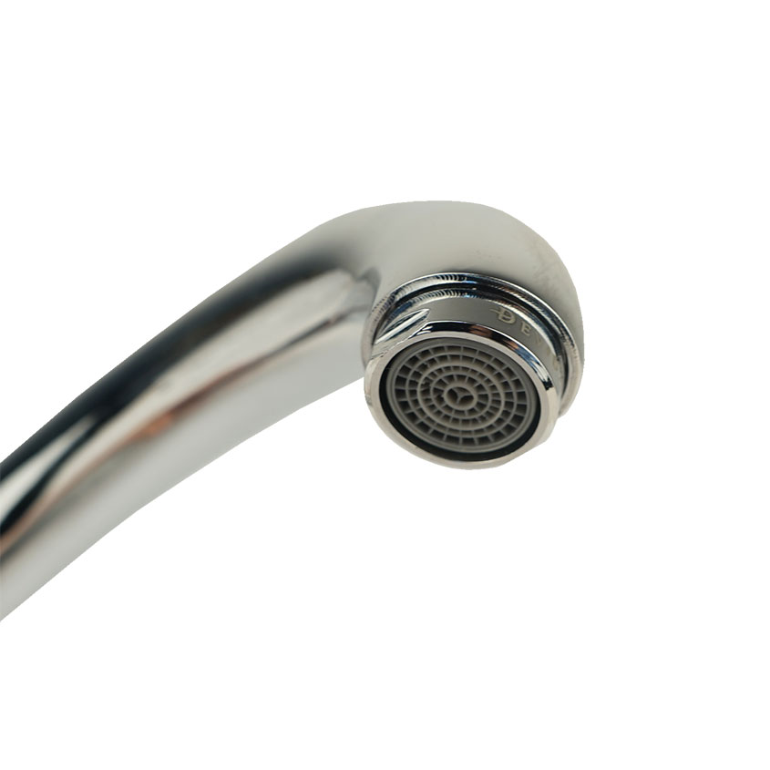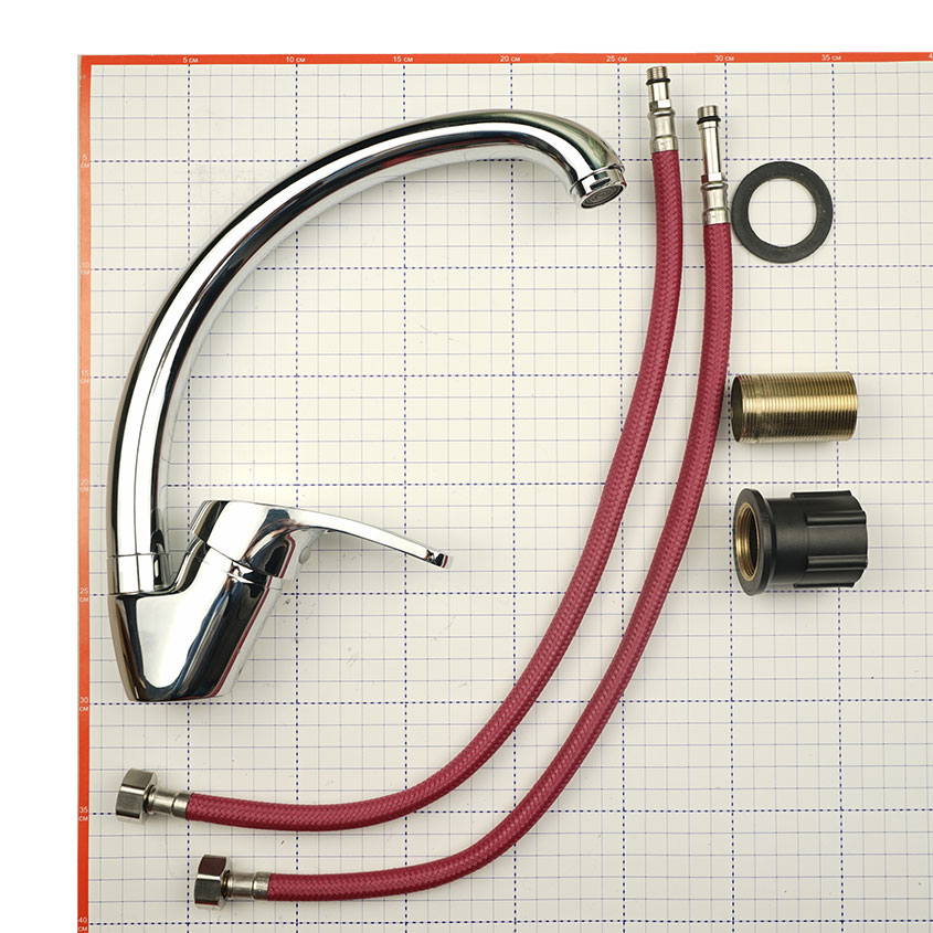 Смесительсреднего сегмента для кухни с боковым расположением ручки, с креплением на гайке, позволяющей легко закрепить смеситель на столешнице или мойке без использования инструментов. В качестве запорной арматуры используется картридж типоразмера 40 мм. Длина излива по осям составляет 215 мм, но фактически вынос излива над мойком можно изменить, расположив смеситель ручкой сзади или спереди. Высота от уровня столешницы до аэратора составляет 225 мм и, с учетом глубины мойки, позволяет легко набирать воду в глубокие емкости (вазы, кастрюли, ведра и пр.). Максимальная высота смесителя - 268 мм.