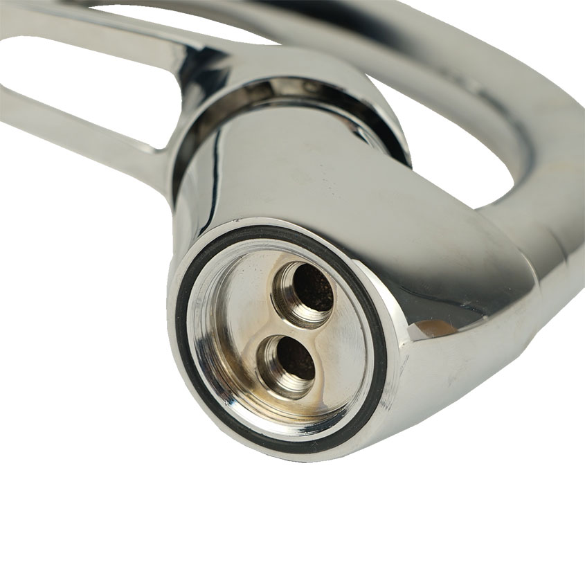От более экономных аналогов смеситель отличается массивной ручкой с отверстием и более длинным и высоким изливом.