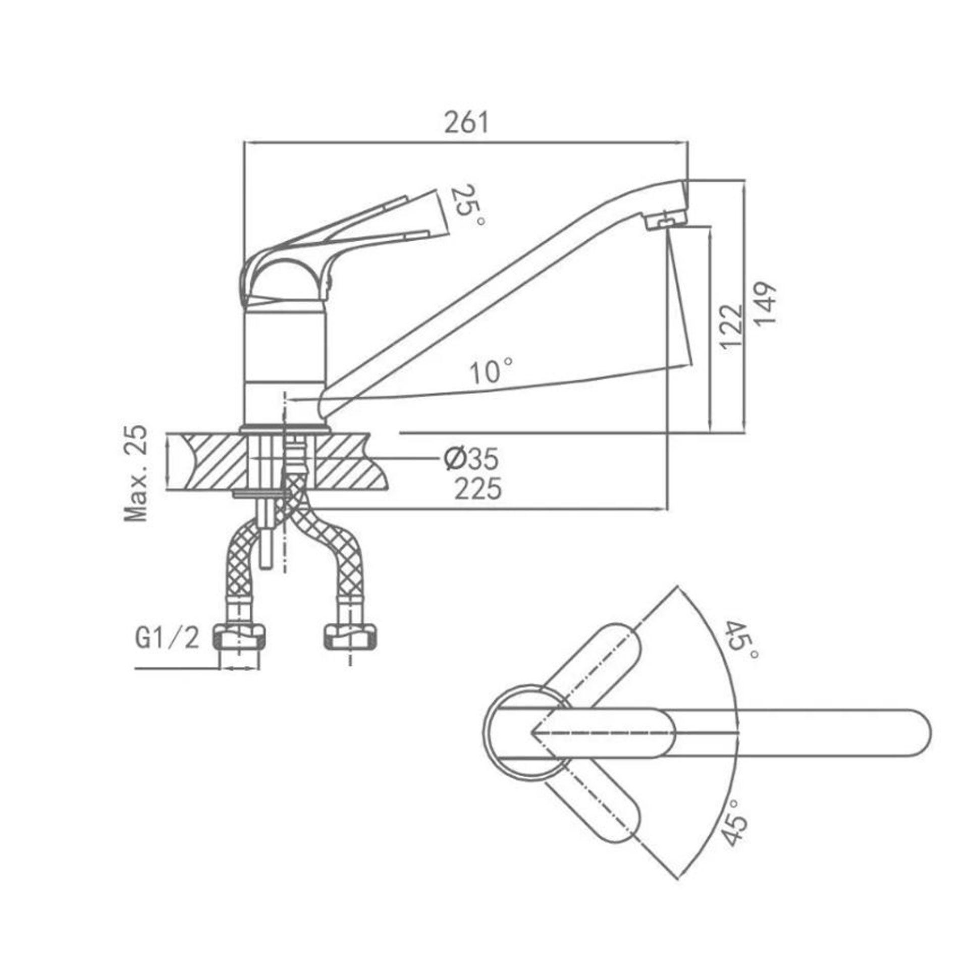 Комплектность: корпус смесителя, 2 шланга-подводки длиной 40см, комплект крепления к мойке