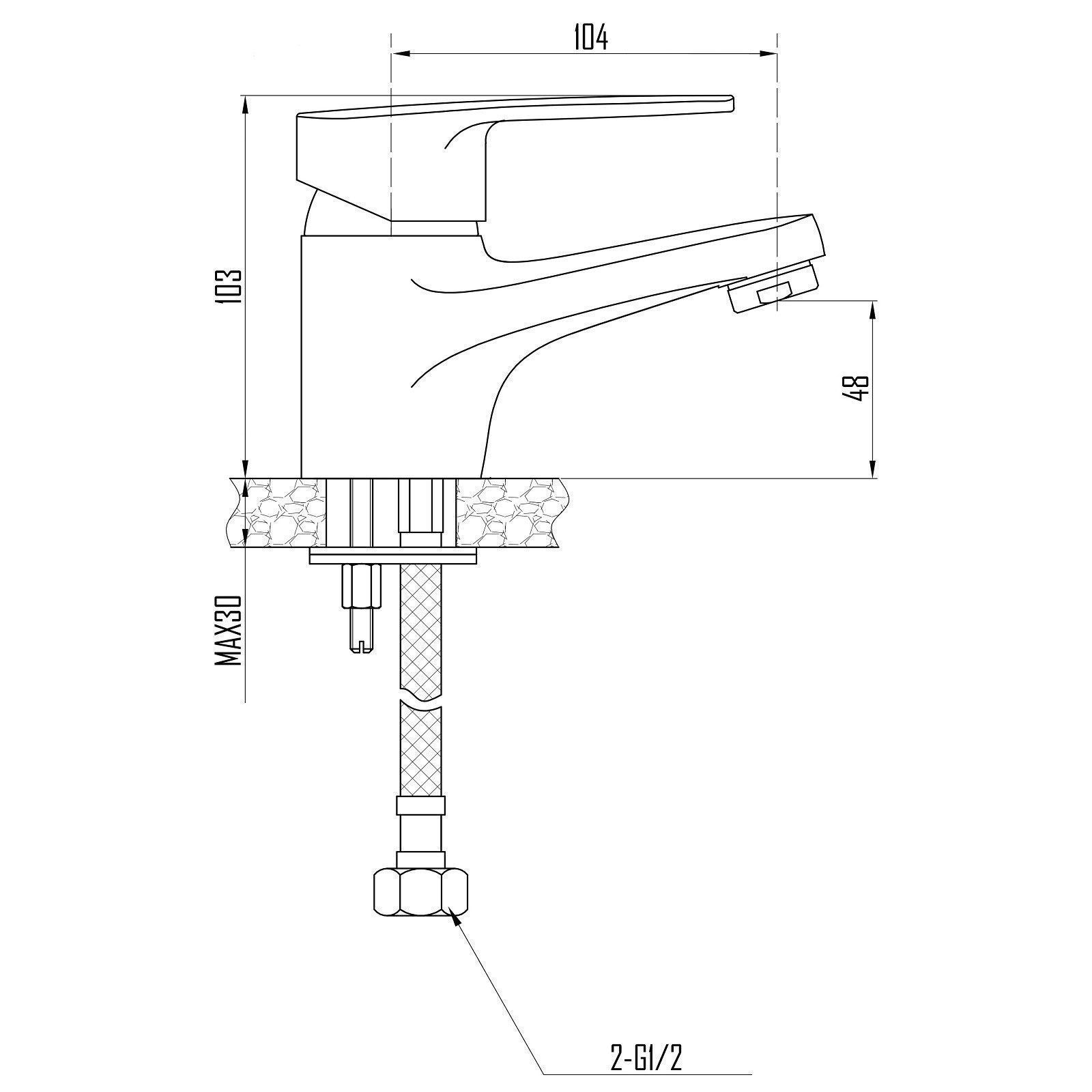 Смеситель базового сегмента для раковины, с креплением на шпильке отличается простотой конструкции и традиционным дизайном. В качестве запорной арматуры используется картридж типоразмера 40 мм. Длина излива по осям корпус-аэратор составляет 104 мм. Высота от уровня столешницы до аэратора составляет 48 мм. Максимальная высота смесителя - 113 мм.