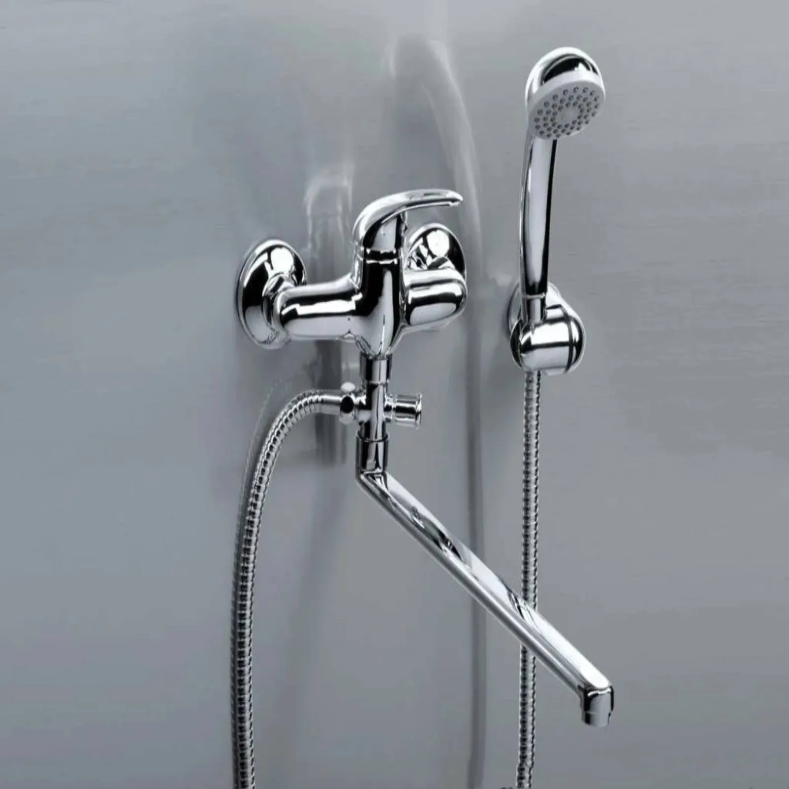 Однозахватрый пристенный смеситель для ванны с ручкой типа "B" из цинкового сплава и с отверстием на рычаге. Картридж металлокерамический 35 мм. Комплект пристенного крепления включает в себя уплотнительные прокладки, эксцентрики и глубокие хромированные чашки отражателей. Дивертор (переключатель) с излива на душ наружный, штокового типа.