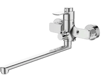Смеситель премиального сегмента для ванны отличается от аналогичных смесителей на рынке раздельной регулировкой температуры и напора воды. Соотношение горячей и холодной воды устанавливается верхней ручкой, тогда как для изменения напора используется традиционная большая ручка-рычаг. Это особенно удобно людям с нарушенной моторикой и детям, которым трудно одной ручкой регулировать и температуру, и напор. В качестве запорной арматуры используется особый каттридж с усиленным латунным штоком. Длина излива составляет 350 мм, однако, учитывая длину крепежного комплекта, фактический вынос излива от стены составляет не менее 380 мм. Максимальная высота смесителя от оси крепления составляет 118 мм. Встроенный дивертор не только уменьшает количество резьбовых соединений, но и делает смеситель менее громоздким. В комплект смесителя входит крепежный набор, двухпозиционный кронштейн для пристенного крепления лейки, большая лейка с ситом диаметром 100 мм и качественный хромированный шланг для душа с двойным замком и устойчивым к перепадам температур полимерным внутренним шлангом. Отличительной особенностью крепежного комплекта являются эксцентрики из нержавеющей стали 304 с шумоподавляющими вставками из нетоксичной EPDM-резины.