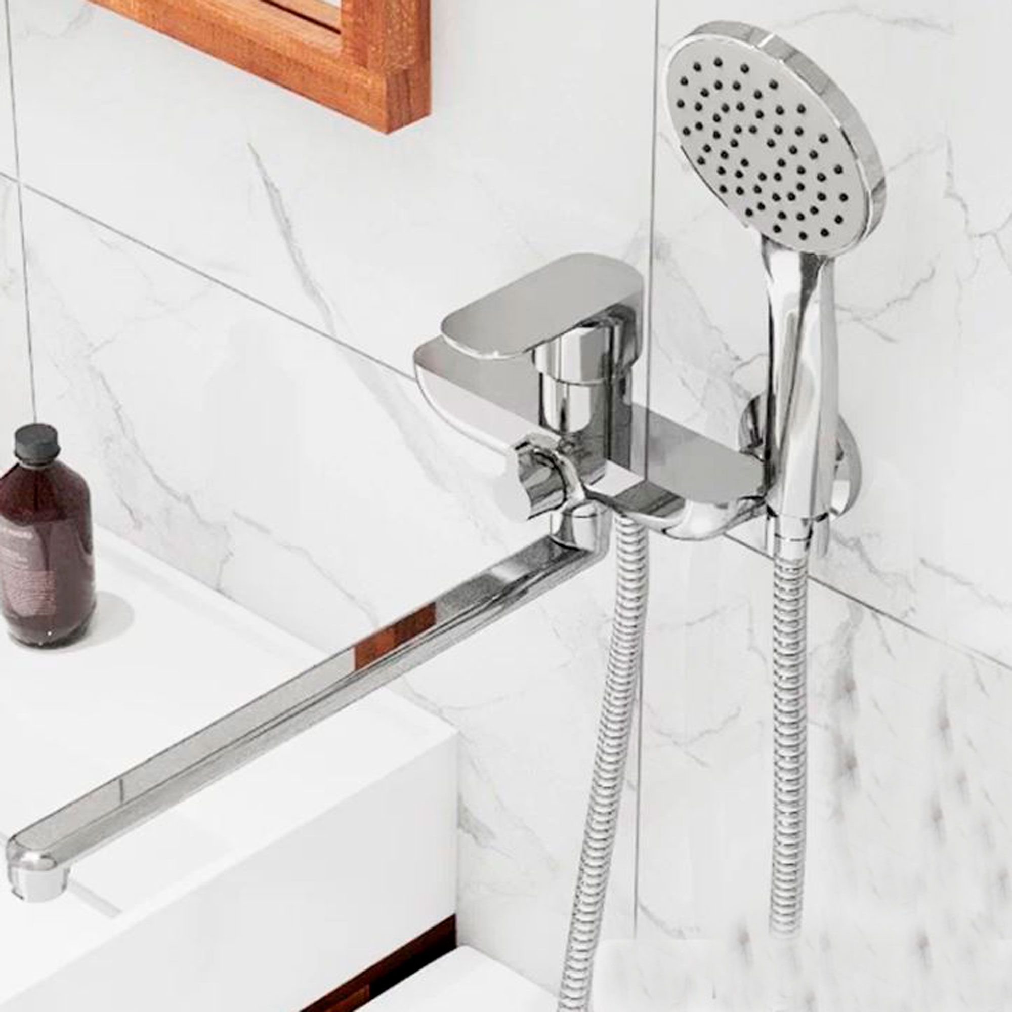 Увеличенный слой никель-хромового покрытия Chrome Plus придает смесителю неизменный блеск в течение всего срока эксплуатации. Боковой держатель для лейки на корпусе смесителя позволяет удобно расположить лейку под рукой. Поворотный излив 350 мм позволяет совместить смеситель для ванны с рядом стоящим умывальником