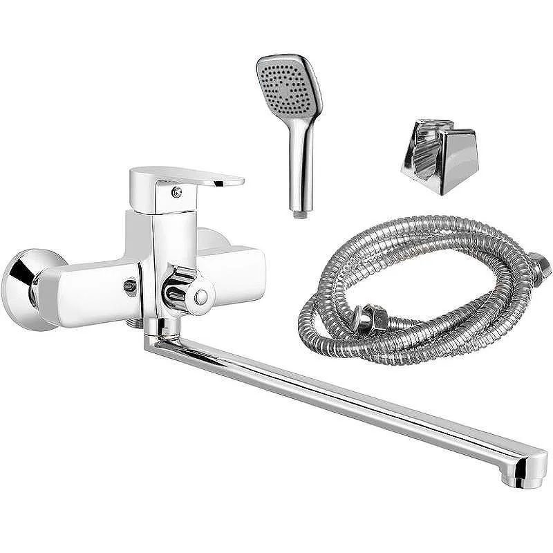 - Комплексное оснащение. В комплекте есть душевой шланг длиной 1500 мм и держатель для душа, что делает установку более простой и быстрой;