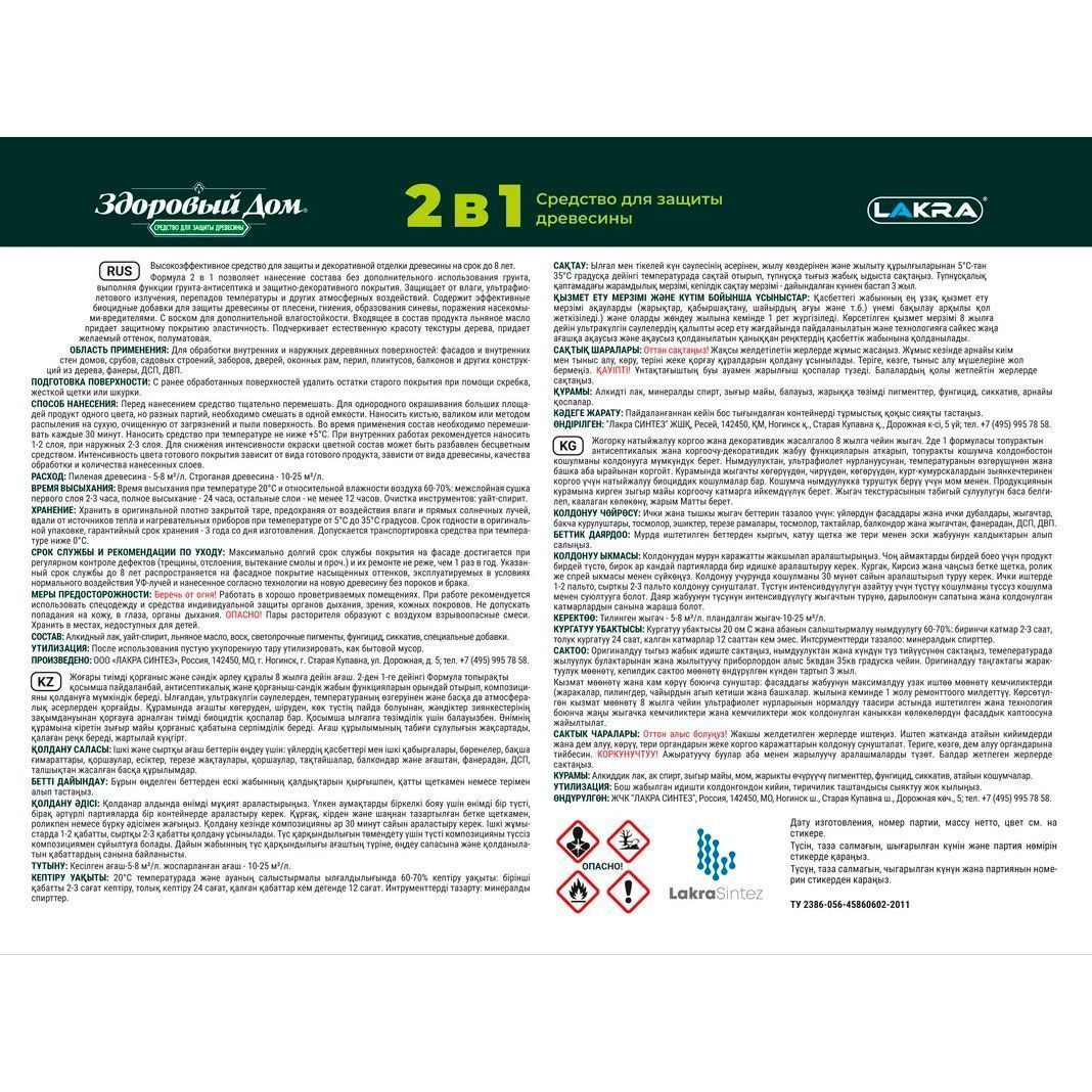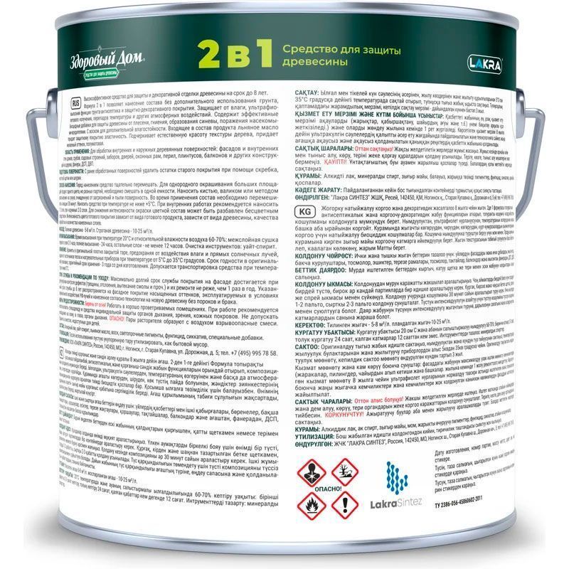 Состав деревозащитный Здоровый дом алкидный. Высокоэффективное средство для защитно-декоративной отделки древесины. Образует полупрозрачное полуматовое покрытие, стойкое к влаге, УФ-излучению, перепадам температуры и другим атмосферным воздействиям.