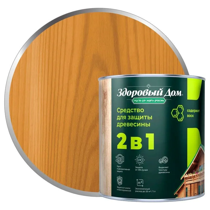Состав деревозащитный Здоровый дом алкидный. Высокоэффективное средство для защитно-декоративной отделки древесины. Образует полупрозрачное полуматовое покрытие, стойкое к влаге, УФ-излучению, перепадам температуры и другим атмосферным воздействиям.