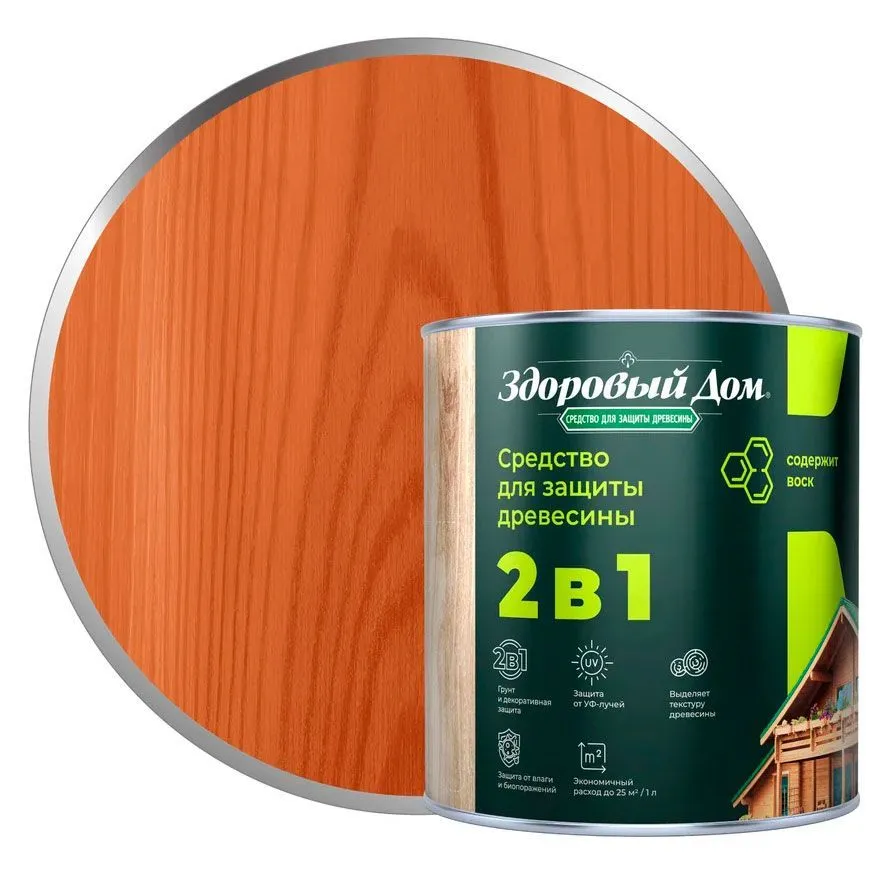 Состав деревозащитный Здоровый дом алкидный. Высокоэффективное средство для защитно-декоративной отделки древесины. Образует полупрозрачное полуматовое покрытие, стойкое к влаге, УФ-излучению, перепадам температуры и другим атмосферным воздействиям.